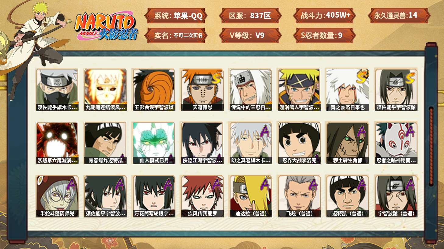 【火影忍者】【lyhy11118】战斗力:405w;段位:暗部2阶;本服排名:1150;vip:v9级;s忍:9个;a忍:23个;通灵兽:14个,s忍:须佐能乎旗木卡卡西|九喇嘛连结波风水门|五影会谈宇智波斑|天道佩恩|传说中的三忍自来也|漩涡鸣人宇智波佐助|舞之豪杰自来也|须佐能乎宇智波鼬|暴怒第六尾漩涡鸣人__a忍:青春爆炸迈特凯|仙人模式巳月|侠隐江湖宇智波佐助|幻之真容旗木卡卡西|忍界大战李洛克|秽土转生角都|忍者之路神秘面具男|半蛇斗篷药师兜|须佐能乎宇智波佐助|万花筒写轮眼宇智波佐助|疾风传我爱罗|迪达拉(普通)|飞段(普通)|迈特凯(普通)|宇智波鼬(普通)|干柿鬼鲛(普通)|秽土转生桃地再不斩|蝎(普通)|猿飞阿斯玛(普通)|不缘|宇智波泉奈|羁绊神农|初始形态机械鸣人__通灵兽:忍犬(普通)|蓝蛇|砂之守鹤|蛤蟆吉|忍龟|镰鼬|猿魔|山椒鱼|蜃|蛤蟆仙人|鲛鲨|蛤蟆健|蛞蝓(普通)|乌鸦(普通)
