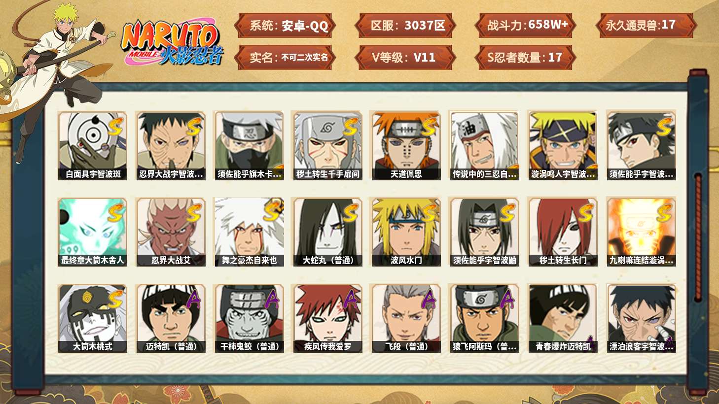 【火影忍者】【lyhy11112】战斗力:658w;段位:中忍3阶;本服排名:909;vip:v11级;s忍:17个;a忍:29个;通灵兽:17个,s忍:白面具宇智波斑|忍界大战宇智波带土|须佐能乎旗木卡卡西|秽土转生千手扉间|天道佩恩|传说中的三忍自来也|漩涡鸣人宇智波佐助|须佐能乎宇智波止水|最终章大筒木舍人|忍界大战艾|舞之豪杰自来也|大蛇丸(普通)|波风水门|须佐能乎宇智波鼬|秽土转生长门|九喇嘛连结漩涡鸣人|大筒木桃式__a忍:青春爆炸迈特凯|漂泊浪客宇智波带土|仙人模式巳月|侠隐江湖宇智波佐助|忍界大战李洛克|秽土转生角都|忍者之路神秘面具男|青年波风水门|青年艾|半蛇斗篷药师兜|百豪春野樱|忍界大战秋道丁次|秽土转生猿飞阿斯玛|万花筒写轮眼宇智波佐助|五代目雷影达鲁伊|死司凭血飞段|疾风传我爱罗 3星|飞段(普通) 3星|迈特凯(普通) 4星|夏日限定宇智波鼬|干柿鬼鲛(普通) 4星|秽土转生桃地再不斩|蝎(普通)|猿飞阿斯玛(普通) 3星|桃式显现漩涡博人|最终章日向雏田|宇智波泉奈|羁绊神农|初始形态机械鸣人__通灵兽:忍犬(普通)|蓝蛇|砂之守鹤|蛤蟆吉|忍龟|镰鼬|猿魔|山椒鱼|蜃|蛤蟆仙人|鲛鲨|蛤蟆健|蛞蝓(普通)|乌鸦(普通)|蛤蟆龙|蛤蟆广|熊猫