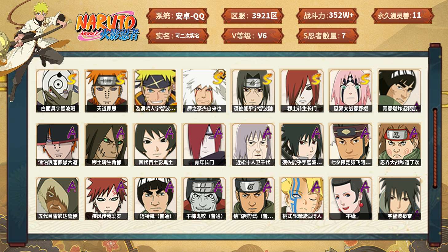 【火影忍者】【lyhy11100】战斗力:352w;段位:上忍1阶;本服排名:4;vip:v6级;s忍:7个;a忍:20个;通灵兽:11个,s忍:白面具宇智波斑|天道佩恩|漩涡鸣人宇智波佐助|舞之豪杰自来也|须佐能乎宇智波鼬|秽土转生长门|忍界大战春野樱__a忍:青春爆炸迈特凯|漂泊浪客佩恩六道|秽土转生角都|四代目土影黑土|青年长门|近松十人卫千代|须佐能乎宇智波佐助|七夕限定猿飞阿斯玛|忍界大战秋道丁次|五代目雷影达鲁伊|疾风传我爱罗|迈特凯(普通)|干柿鬼鲛(普通)|猿飞阿斯玛(普通)|桃式显现漩涡博人|不缘|宇智波泉奈|羁绊神农|初始形态机械鸣人|侠隐江湖大野木__通灵兽:忍犬(普通)|蓝蛇|蛤蟆吉|忍龟|砂之守鹤|镰鼬|猿魔|山椒鱼|蜃|蛤蟆仙人|鲛鲨