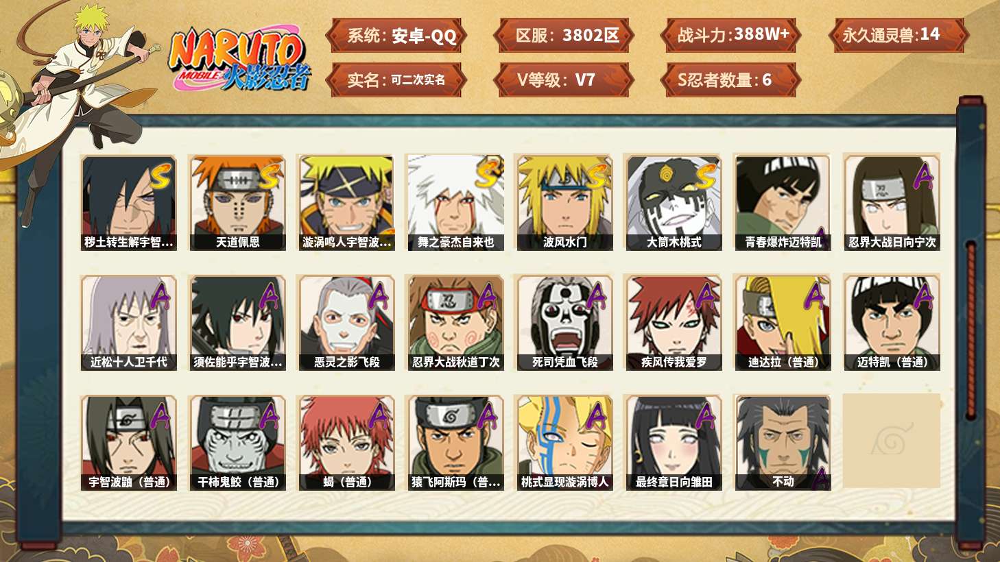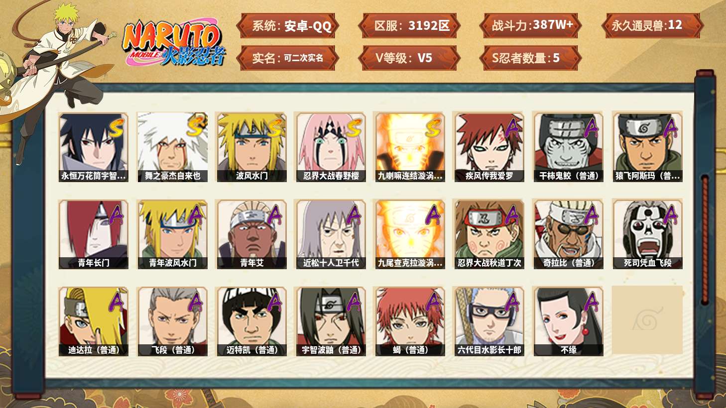 【火影忍者】【lyhy11120】战斗力:387w;段位:见习1阶;本服排名:3217;vip:v5级;s忍:5个;a忍:18个;通灵兽:12个,s忍:永恒万花筒宇智波佐助|舞之豪杰自来也|波风水门|忍界大战春野樱|九喇嘛连结漩涡鸣人__a忍:青年长门|青年波风水门|青年艾|近松十人卫千代|九尾查克拉漩涡鸣人|忍界大战秋道丁次|奇拉比(普通)|死司凭血飞段|疾风传我爱罗 3星|迪达拉(普通)|飞段(普通)|迈特凯(普通)|宇智波鼬(普通)|干柿鬼鲛(普通) 3星|蝎(普通)|猿飞阿斯玛(普通) 3星|六代目水影长十郎|不缘__通灵兽:忍犬(普通)|蓝蛇|蛤蟆吉|砂之守鹤|忍龟|镰鼬|猿魔|山椒鱼|蜃|蛤蟆仙人|鲛鲨|蛤蟆健