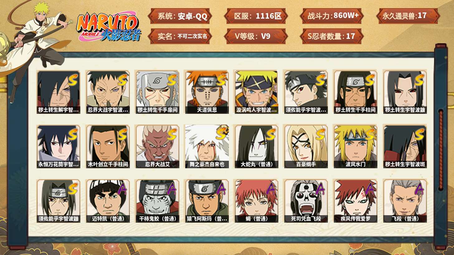 【火影忍者】【lyhy11105】战斗力:860w;段位:上忍3阶;本服排名:807;vip:v9级;s忍:17个;a忍:31个;通灵兽:17个,s忍:秽土转生解宇智波斑|忍界大战宇智波带土|秽土转生千手扉间|天道佩恩|漩涡鸣人宇智波佐助|须佐能乎宇智波止水|秽土转生千手柱间|秽土转生宇智波鼬|永恒万花筒宇智波佐助|木叶创立千手柱间|忍界大战艾|舞之豪杰自来也|大蛇丸(普通)|百豪纲手|波风水门|秽土转生宇智波斑|须佐能乎宇智波鼬__a忍:青春爆炸迈特凯|幻之真容旗木卡卡西|忍界大战李洛克|忍界大战日向宁次|四代目土影黑土|忍者之路神秘面具男|宇智波止水(普通)|忍界大战奇拉比|青年波风水门|近松十人卫千代|半蛇斗篷药师兜|须佐能乎宇智波佐助|九尾查克拉漩涡鸣人|忍界大战秋道丁次|忍界大战我爱罗|秽土转生猿飞阿斯玛|万花筒写轮眼宇智波佐助|死司凭血飞段 3星|疾风传我爱罗 3星|飞段(普通) 3星|仙人模式漩涡鸣人|万花筒写轮眼旗木卡卡西|迈特凯(普通) 5星|宇智波鼬(普通)|干柿鬼鲛(普通) 5星|秽土转生桃地再不斩|蝎(普通) 4星|猿飞阿斯玛(普通) 5星|桃式显现漩涡博人|六代目水影长十郎|宇智波泉奈__通灵兽:忍犬(普通)|蓝蛇|蛤蟆吉|忍龟|镰鼬|猿魔|山椒鱼|蜃|蛤蟆仙人|鲛鲨|蛤蟆健|乌鸦(普通)|砂之守鹤|蛤蟆龙|蛞蝓(普通)|蛤蟆广|梦貘