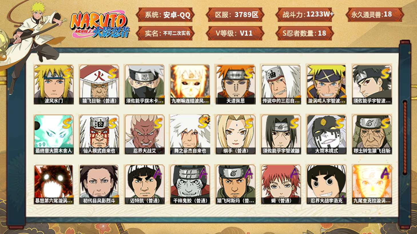 【火影忍者】【lyhy11123】战斗力:1233w;段位:上忍1阶;本服排名:47;vip:v11级;s忍:18个;a忍:29个;通灵兽:18个,s忍:须佐能乎旗木卡卡西|九喇嘛连结波风水门|天道佩恩|传说中的三忍自来也|漩涡鸣人宇智波佐助|须佐能乎宇智波止水|最终章大筒木舍人|仙人模式自来也|忍界大战艾|舞之豪杰自来也|纲手(普通)|波风水门 4星|须佐能乎宇智波鼬|大筒木桃式|猿飞日斩(普通) 4星|秽土转生猿飞日斩|暴怒第六尾漩涡鸣人|初代目风影烈斗__a忍:青春爆炸迈特凯|仙人模式巳月|忍界大战李洛克 3星|秽土转生角都|忍者之路神秘面具男|近松十人卫千代|半蛇斗篷药师兜|九尾查克拉漩涡鸣人 3星|晓大蛇丸|忍界大战秋道丁次|奇拉比(普通)|死司凭血飞段|疾风传我爱罗 3星|迪达拉(普通)|飞段(普通)|迈特凯(普通) 5星|宇智波鼬(普通)|干柿鬼鲛(普通) 5星|秽土转生桃地再不斩|桃地再不斩|蝎(普通) 4星|绯流琥蝎 3星|猿飞阿斯玛(普通) 5星|桃式显现漩涡博人|不缘|宇智波泉奈|羁绊神农|忍界大战土台|初始形态机械鸣人__通灵兽:忍犬(普通)|蓝蛇|蛤蟆吉|忍龟|镰鼬|砂之守鹤|猿魔|山椒鱼|蜃|蛤蟆仙人|鲛鲨|蛤蟆健|乌鸦(普通)|蛞蝓(普通)|熊猫|蛤蟆龙|蛤蟆广|梦貘