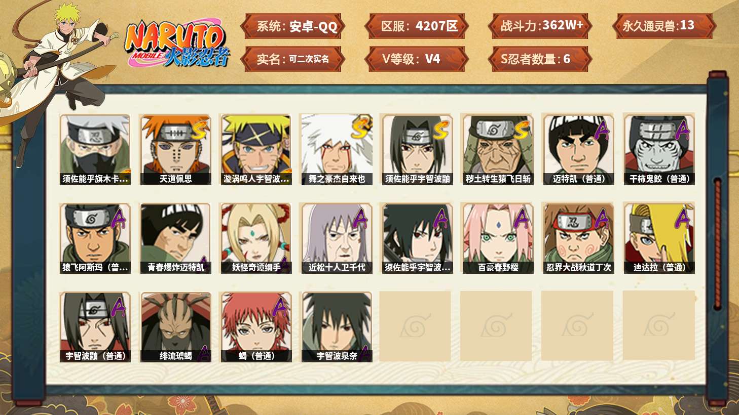 【火影忍者】【lyhy11127】战斗力:362w;段位:中忍1阶;本服排名:1014;vip:v4级;s忍:6个;a忍:14个;通灵兽:13个,s忍:须佐能乎旗木卡卡西|天道佩恩|漩涡鸣人宇智波佐助|舞之豪杰自来也|须佐能乎宇智波鼬|秽土转生猿飞日斩__a忍:青春爆炸迈特凯|妖怪奇谭纲手|近松十人卫千代|须佐能乎宇智波佐助|百豪春野樱|忍界大战秋道丁次|迪达拉(普通)|迈特凯(普通) 3星|宇智波鼬(普通)|干柿鬼鲛(普通) 3星|绯流琥蝎|蝎(普通)|猿飞阿斯玛(普通) 3星|宇智波泉奈__通灵兽:忍犬(普通)|蓝蛇|蛤蟆吉|忍龟|镰鼬|猿魔|山椒鱼|蜃|蛤蟆仙人|鲛鲨|砂之守鹤|蛤蟆健|乌鸦(普通)