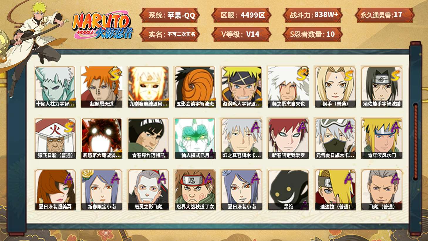 【火影忍者】【lyhy11279】战斗力:838w;段位:上忍1阶;本服排名:8;vip:v14级;s忍:10个;a忍:26个;通灵兽:17个,s忍:十尾人柱力宇智波带土|超佩恩天道|九喇嘛连结波风水门|五影会谈宇智波斑|漩涡鸣人宇智波佐助|舞之豪杰自来也|纲手(普通)|须佐能乎宇智波鼬|猿飞日斩(普通)|暴怒第六尾漩涡鸣人__a忍:青春爆炸迈特凯|仙人模式巳月|幻之真容旗木卡卡西|新春限定我爱罗|元气夏日旗木卡卡西|青年波风水门|夏日泳装照美冥|新春限定小南|恶灵之影飞段|忍界大战秋道丁次|夏日泳装小南|黑绝|迪达拉(普通)|飞段(普通)|旗木卡卡西(普通)|迈特凯(普通)|宇智波鼬(普通)|夏日限定宇智波鼬|干柿鬼鲛(普通)|蝎(普通)|猿飞阿斯玛(普通)|羁绊神农|夏日限定黑土|忍界大战土台|初始形态机械鸣人|侠隐江湖大野木__通灵兽:忍犬(普通)|蓝蛇|蛤蟆吉|忍龟|镰鼬|猿魔|蛞蝓(普通)|砂之守鹤|山椒鱼|蜃|蛤蟆仙人|守鹤(普通)|鲛鲨|蛤蟆健|乌鸦(普通)|蛤蟆龙|熊猫