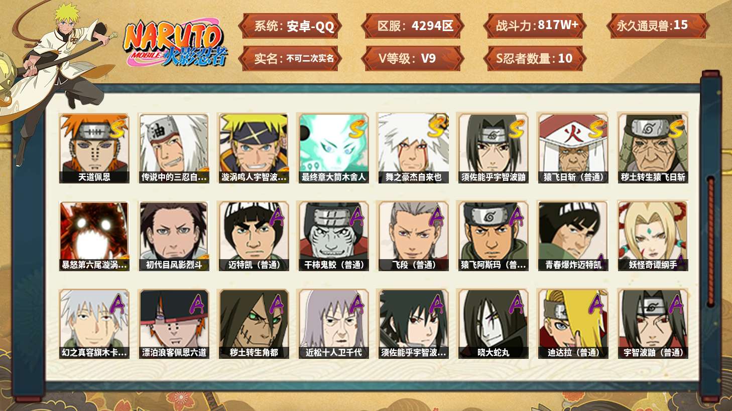 【火影忍者】【lyhy11285】战斗力:817w;段位:中忍3阶;本服排名:43;vip:v9级;s忍:10个;a忍:21个;通灵兽:15个,s忍:天道佩恩|传说中的三忍自来也|漩涡鸣人宇智波佐助|最终章大筒木舍人|舞之豪杰自来也|须佐能乎宇智波鼬|猿飞日斩(普通)|秽土转生猿飞日斩|暴怒第六尾漩涡鸣人|初代目风影烈斗__a忍:青春爆炸迈特凯|妖怪奇谭纲手|幻之真容旗木卡卡西|漂泊浪客佩恩六道|秽土转生角都|近松十人卫千代|须佐能乎宇智波佐助|晓大蛇丸|迪达拉(普通)|飞段(普通) 3星|迈特凯(普通) 5星|宇智波鼬(普通)|干柿鬼鲛(普通) 4星|秽土转生桃地再不斩|绯流琥蝎|蝎(普通)|猿飞阿斯玛(普通) 3星|宇智波泉奈|羁绊神农|忍界大战土台|初始形态机械鸣人__通灵兽:忍犬(普通)|蓝蛇|蛤蟆吉|忍龟|镰鼬|砂之守鹤|猿魔|山椒鱼|蜃|蛤蟆仙人|鲛鲨|蛤蟆健|蛞蝓(普通)|乌鸦(普通)|蛤蟆龙