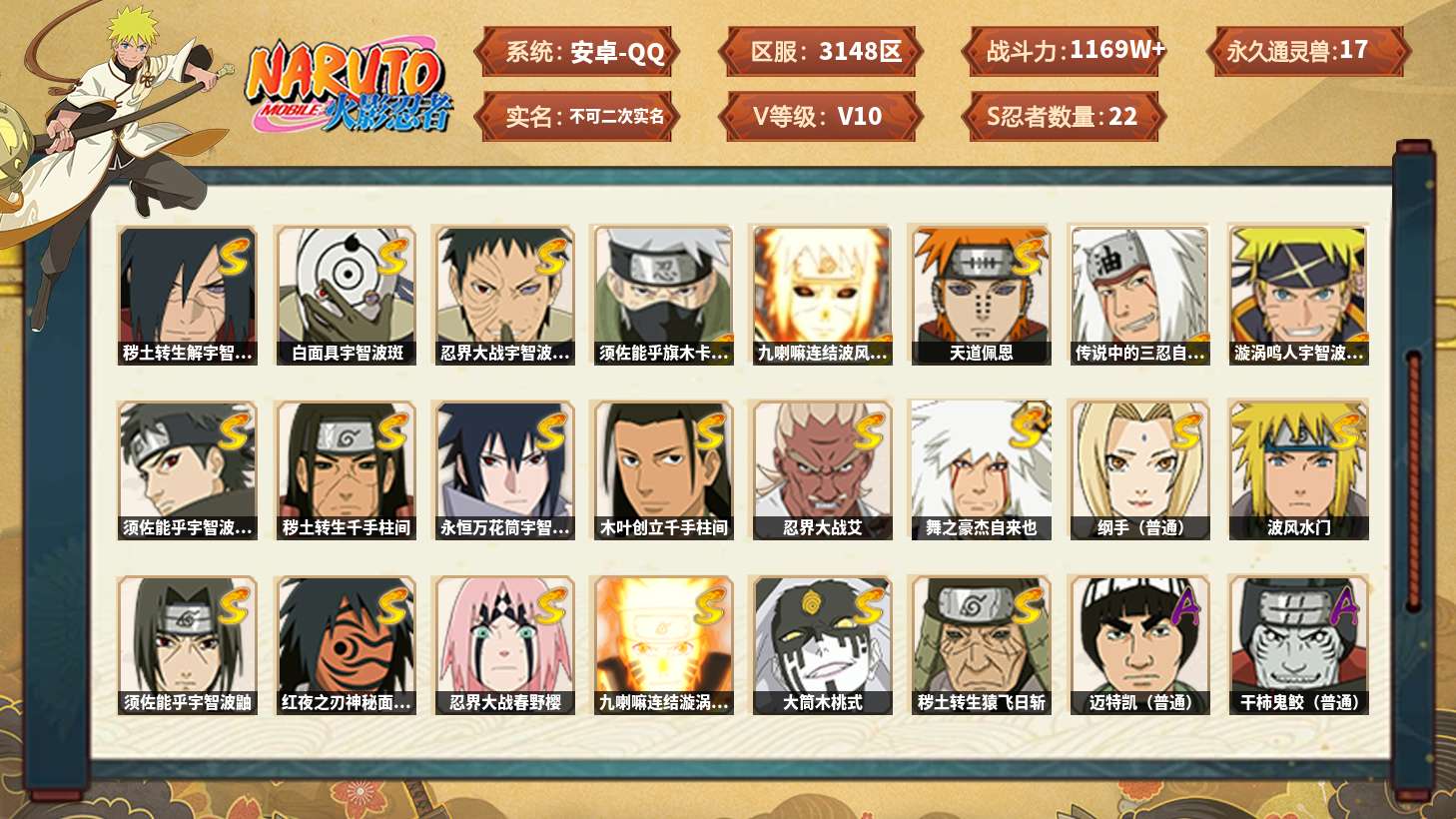 【火影忍者】【lyhy11282】战斗力:1169w;段位:上忍1阶;本服排名:222;vip:v10级;s忍:22个;a忍:34个;通灵兽:17个,s忍:秽土转生解宇智波斑|白面具宇智波斑|忍界大战宇智波带土|须佐能乎旗木卡卡西|九喇嘛连结波风水门|天道佩恩|传说中的三忍自来也|漩涡鸣人宇智波佐助|须佐能乎宇智波止水|秽土转生千手柱间|永恒万花筒宇智波佐助|木叶创立千手柱间|忍界大战艾|舞之豪杰自来也|纲手(普通)|波风水门|须佐能乎宇智波鼬|红夜之刃神秘面具男|忍界大战春野樱|九喇嘛连结漩涡鸣人|大筒木桃式|秽土转生猿飞日斩__a忍:青春爆炸迈特凯|幻之真容旗木卡卡西|忍界大战李洛克|忍界大战日向宁次 3星|四代目土影黑土|青年长门|忍者之路神秘面具男|不风|青年波风水门|青年艾|近松十人卫千代|半蛇斗篷药师兜|须佐能乎宇智波佐助|百豪春野樱|忍界大战秋道丁次|秽土转生猿飞阿斯玛|奇拉比(普通)|死司凭血飞段|疾风传我爱罗 4星|迪达拉(普通)|飞段(普通) 4星|漂泊浪客小南|迈特凯(普通) 5星|宇智波鼬(普通)|干柿鬼鲛(普通) 5星|秽土转生桃地再不斩|蝎(普通) 4星|绯流琥蝎|猿飞阿斯玛(普通) 5星|桃式显现漩涡博人|最终章日向雏田|六代目水影长十郎|不缘|宇智波泉奈__通灵兽:忍犬(普通)|蓝蛇|蛤蟆吉|忍龟|砂之守鹤|镰鼬|猿魔|山椒鱼|蜃|蛤蟆仙人|鲛鲨|蛤蟆健|乌鸦(普通)|蛤蟆龙|蛞蝓(普通)|蛤蟆广|梦貘