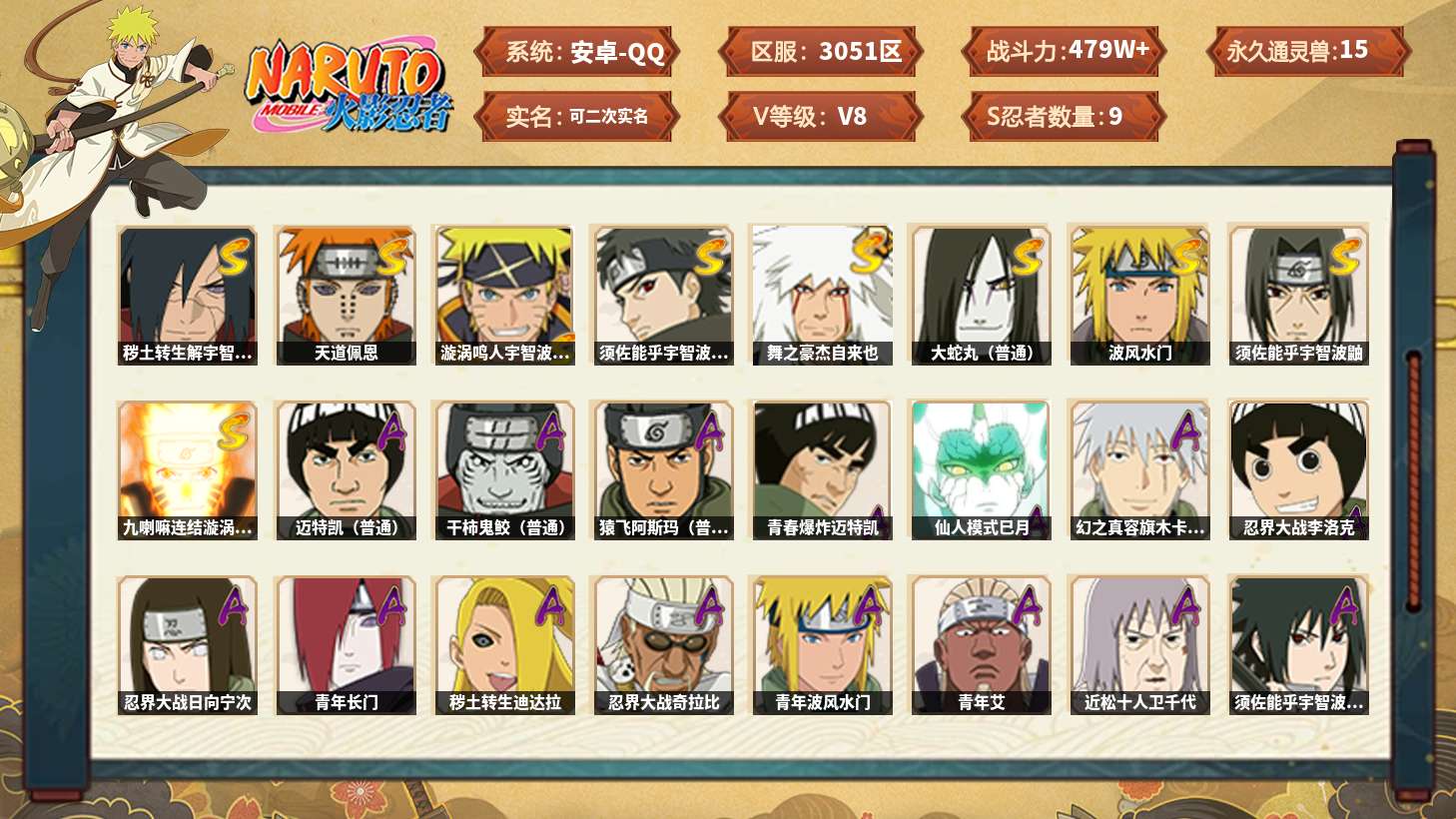 【火影忍者】【lyhy11283】战斗力:479w;段位:中忍3阶;本服排名:2545;vip:v8级;s忍:9个;a忍:31个;通灵兽:15个,s忍:秽土转生解宇智波斑|天道佩恩|漩涡鸣人宇智波佐助|须佐能乎宇智波止水|舞之豪杰自来也|大蛇丸(普通)|波风水门|须佐能乎宇智波鼬|九喇嘛连结漩涡鸣人__a忍:青春爆炸迈特凯|仙人模式巳月|幻之真容旗木卡卡西|忍界大战李洛克|忍界大战日向宁次|青年长门|秽土转生迪达拉|忍界大战奇拉比|青年波风水门|青年艾|近松十人卫千代|须佐能乎宇智波佐助|恶灵之影飞段|火影继承人猿飞日斩|忍界大战秋道丁次|秽土转生猿飞阿斯玛|奇拉比(普通)|死司凭血飞段|疾风传我爱罗|迪达拉(普通)|飞段(普通)|迈特凯(普通) 4星|宇智波鼬(普通)|干柿鬼鲛(普通) 4星|秽土转生桃地再不斩|蝎(普通)|猿飞阿斯玛(普通) 4星|宇智波泉奈|羁绊神农|夏日限定黑土|初始形态机械鸣人__通灵兽:忍犬(普通)|蓝蛇|蛤蟆吉|忍龟|砂之守鹤|镰鼬|猿魔|山椒鱼|蜃|蛤蟆仙人|鲛鲨|辛牙|蛤蟆健|乌鸦(普通)|蛞蝓(普通)