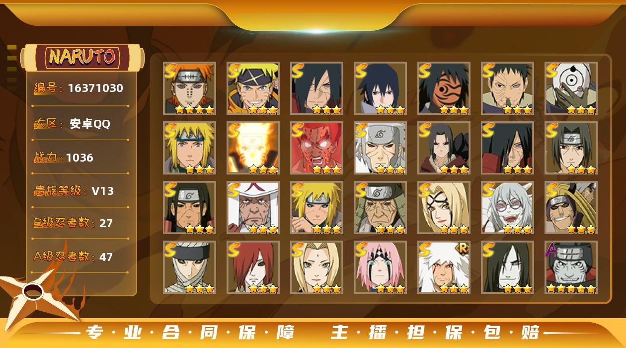 2388887-ios/13s忍/24a忍/战力515w/v11/区服577 【s忍者】 宇智波止水「须佐能乎」,艾「忍界大战」,宇智波斑「秽土转生·解」,千手柱间「木叶创立」,宇智波佐助「永恒万花筒」,自来也「舞之豪杰」,旗木卡卡西「须佐能乎」,自来也「传说中的三忍」,漩涡鸣人「暴怒·第六尾」,宇智波鼬「须佐能乎」,佩恩「天道」,波风水门,波风水门「九喇嘛连结」, 【a忍者】 机械鸣人「初