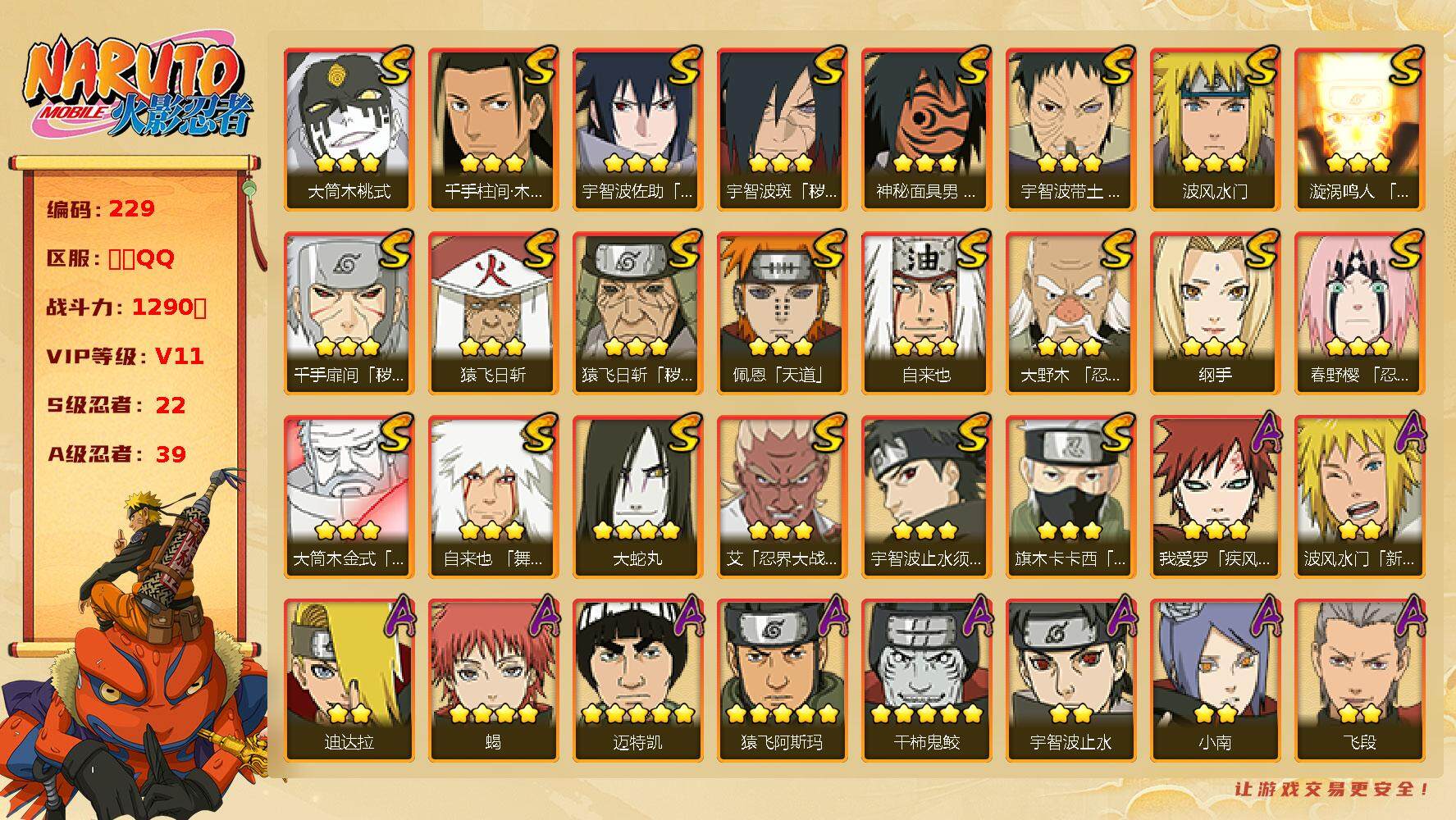 [11316002]v11 22s忍 39a忍 196忍 2855s碎片 20通灵 1290w战力,仙人自来也82片,天道超50,舍人65片,高招卷80,yy1003 【s级忍者】:猿飞日斩「秽土转生」3星,千手扉间「秽土转生」3星,宇智波斑「秽土转生·解」3星,大野木「忍界大战」3星,春野樱「忍界大战」3星,宇智波带土「忍界大战」3星,艾「忍界大战」3星,宇智波止水「须佐能乎」3星,旗木卡卡西「须佐能乎」3星,千手柱间「木叶创立」3星,自来也3星,自来也「舞之豪杰」3星,大蛇丸4星,纲手3星,猿飞日斩3星,波风水门3星,神秘面具男「红夜之刃」3星,漩涡鸣人「九喇嘛连结」3星,佩恩「天道」3星,宇智波佐助「永恒万花筒」3星,大筒木金式3星,大筒木桃式3星 【a级忍者】:艾「青年」2星,长门「青年」2星,波风水门「青年」2星,波风水门「新春限定」2星,迪达拉2星,迪达拉「新春限定」2星,迪达拉「秽土转生」2星,奇拉比「忍界大战」2星,飞段2星,飞段「死司凭血」2星,干柿鬼鲛5星,漩涡博人「桃式显现」2星,漩涡鸣人「九尾查克拉」2星,迈特凯5星,旗木卡卡西「幻之真容」2星,我爱罗「疾风传」3星,我爱罗「新春限定」2星,蝎4星,蝎「绯流琥」2星,小南2星,小南「漂泊浪客」2星,角都「秽土转生」2星,猿飞阿斯玛5星,宇智波止水2星,宇智波鼬2星,宇智波佐助「须佐能乎」2星,宇智波佐助「万花筒写轮眼」2星,照美冥「五代目水影」2星,日向宁次「忍界大战」2星,日向雏田「最终章」2星,长十郎「六代目水影」2星,神秘面具男「忍者之路」2星,佩恩·六道「漂泊浪客」2星,李洛克「忍界大战」2星,秋道丁次「忍界大战」2星,千代「近松十人卫」2星,不缘2星,不风2星,宇智波泉奈2星
