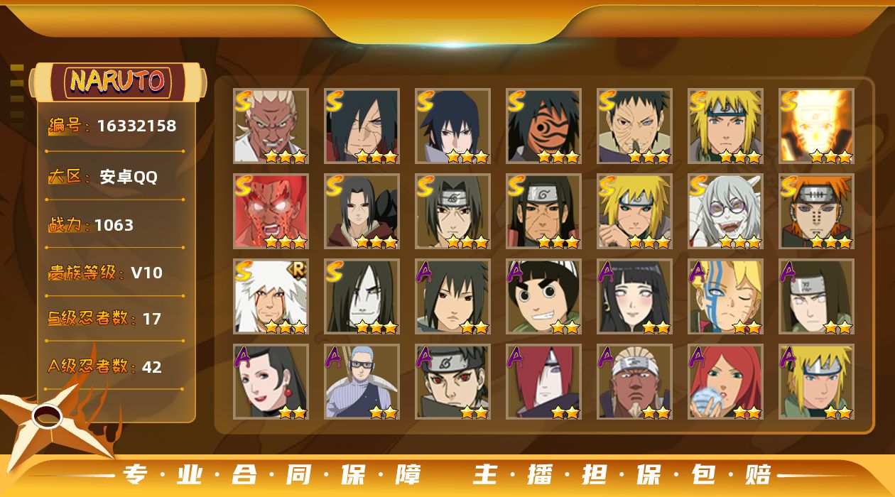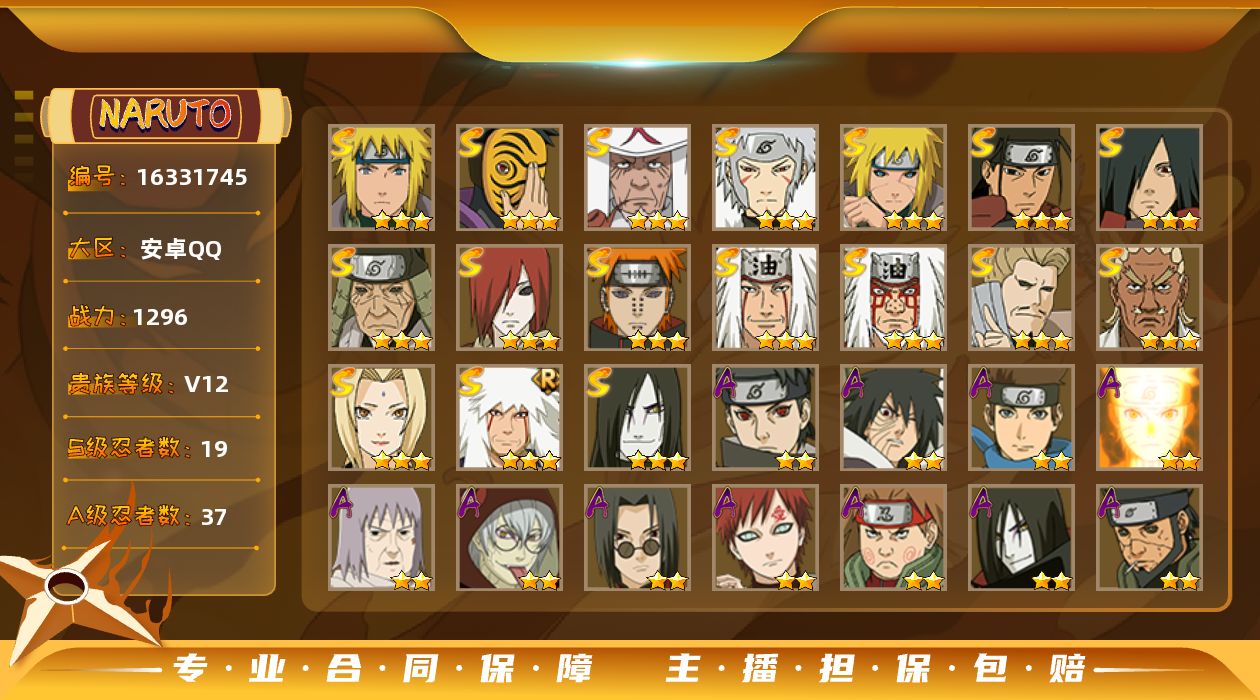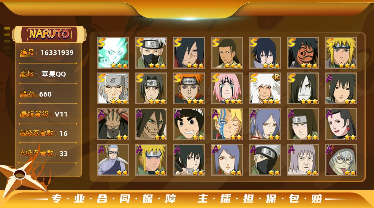 [16331745]19s级忍者数-37a级忍者数 【s级忍者】:长门「秽土转生」3星,猿飞日斩「秽土转生」3星,波风水门「秽土转生」3星,宇智波鼬「须佐能乎」4星,艾「四代目雷影」3星,鬼灯幻月「二代目水影」3星,自来也3星,自来也「仙人模式」3星,自来也「舞之豪杰」3星,大蛇丸3星,纲手4星,千手柱间3星,千手扉间3星,猿飞日斩5星,宇智波斑3星,波风水门3星,神秘面具男4星,佩恩「天道」3星,漩涡鸣人·宇智波佐助3星 【a级忍者】:迪达拉3星,大蛇丸「晓」3星,奇拉比2星,飞段4星,飞段「死司凭血」3星,干柿鬼鲛5星,漩涡鸣人「仙人模式」2星,漩涡鸣人「九尾查克拉」2星,迈特凯5星,迈特凯「惊门」2星,旗木卡卡西「万花筒写轮眼」3星,桃地再不斩2星,我爱罗「疾风传」3星,我爱罗「忍界大战」2星,蝎5星,蝎「百机操演」2星,小南3星,角都2星,角都「地怨虞」2星,猿飞阿斯玛5星,猿飞阿斯玛「秽土转生」2星,宇智波止水2星,猿飞日斩「火影继承人」2星,宇智波鼬2星,宇智波鼬「新春限定」2星,宇智波佐助「万花筒写轮眼」3星,药师兜「半蛇斗篷」2星,照美冥「五代目水影」2星,宇智波带土「暴怒」2星,猿飞木叶丸「博人传」2星,春野樱「百豪」2星,秋道丁次「忍界大战」2星,千代「近松十人卫」2星,阿飞2星,志村团藏2星,巳月「仙人模式」2星,迈特凯「青春爆炸」2星 【通灵兽】:熊猫