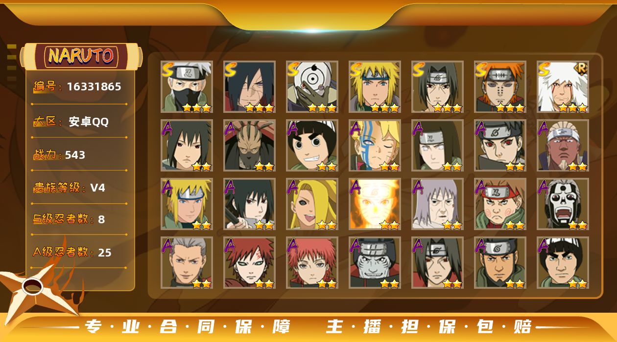 [16331865]8s级忍者数-25a级忍者数 【s级忍者】:宇智波斑「秽土转生·解」3星,宇智波鼬「须佐能乎」3星,旗木卡卡西「须佐能乎」3星,自来也「舞之豪杰」3星,波风水门3星,佩恩「天道」3星,宇智波斑 「白面具」3星宇智波斑「白面具」,漩涡鸣人·宇智波佐助3星 【a级忍者】:艾「青年」2星,波风水门「青年」2星,迪达拉「秽土转生」2星,飞段2星,飞段「死司凭血」2星,干柿鬼鲛2星,漩涡博人「桃式显现」2星,漩涡鸣人「九尾查克拉」2星,迈特凯3星,我爱罗「疾风传」2星,蝎2星,蝎「绯流琥」2星,猿飞阿斯玛3星,宇智波止水2星,宇智波鼬2星,宇智波佐助「须佐能乎」2星,日向宁次「忍界大战」2星,卑留呼「火之意志继承者」2星,李洛克「忍界大战」2星,黑土「博人传」2星,秋道丁次「忍界大战」2星,千代「近松十人卫」2星,宇智波泉奈2星,巳月「仙人模式」2星,迈特凯「青春爆炸」2星