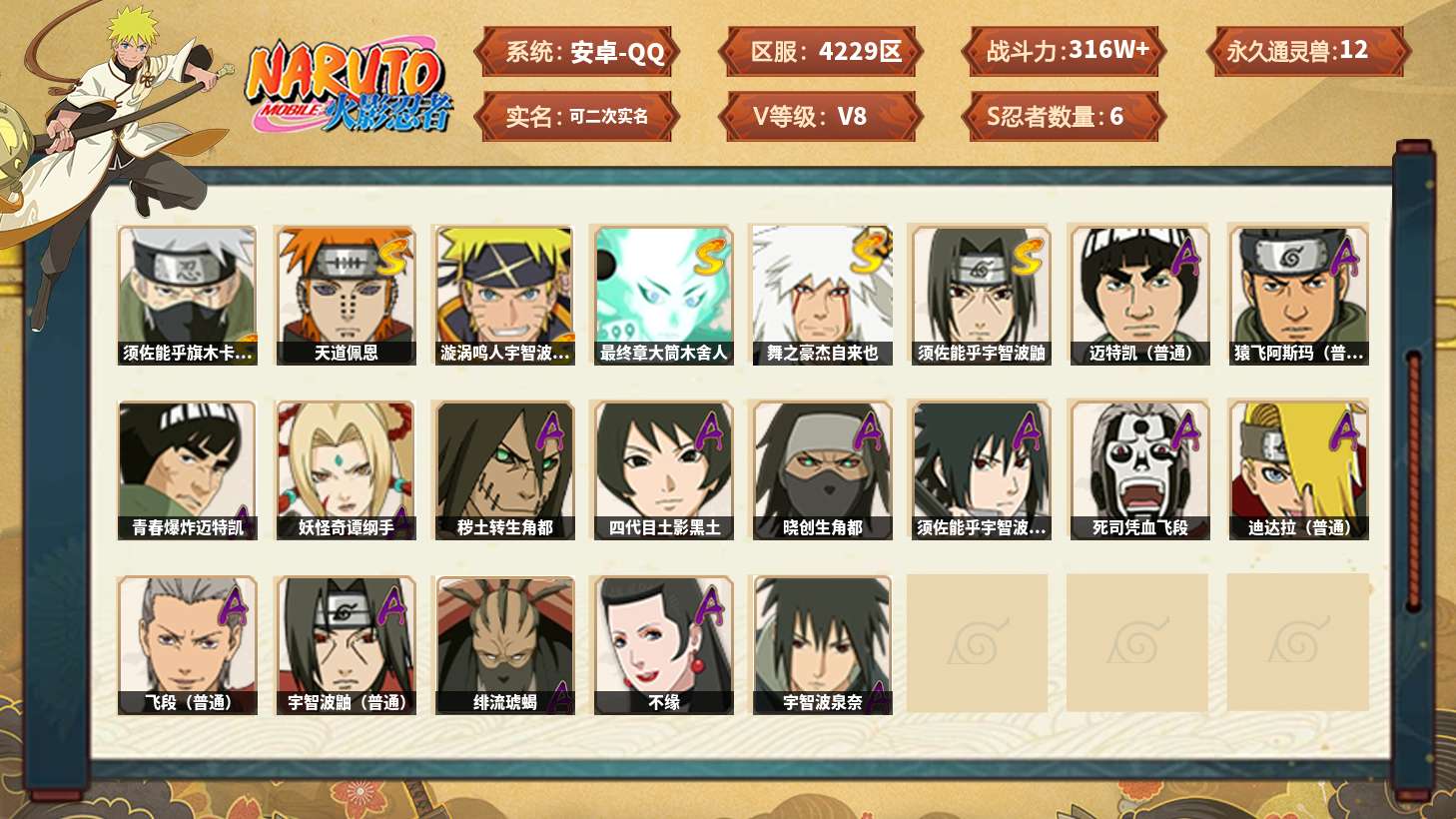【火影忍者】【lyhy11079】战斗力:316w;段位:暗部1阶;本服排名:1157;vip:v8级;s忍:6个;a忍:15个;通灵兽:12个,s忍:须佐能乎旗木卡卡西|天道佩恩|漩涡鸣人宇智波佐助|最终章大筒木舍人|舞之豪杰自来也|须佐能乎宇智波鼬__a忍:青春爆炸迈特凯|妖怪奇谭纲手|秽土转生角都|四代目土影黑土|晓创生角都|须佐能乎宇智波佐助|死司凭血飞段|迪达拉(普通)|飞段(普通)|迈特凯(普通) 3星|宇智波鼬(普通)|绯流琥蝎|猿飞阿斯玛(普通) 3星|不缘|宇智波泉奈__通灵兽:忍犬(普通)|蓝蛇|蛤蟆吉|忍龟|镰鼬|砂之守鹤|猿魔|山椒鱼|蛞蝓(普通)|蜃|蛤蟆仙人|鲛鲨