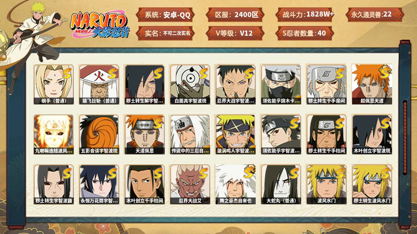 【火影忍者】【lyhy11083】战斗力:1828w;段位:影级1阶;本服排名:57;vip:v12级;s忍:40个;a忍:56个;通灵兽:22个,s忍:秽土转生解宇智波斑|白面具宇智波斑|忍界大战宇智波带土|须佐能乎旗木卡卡西|秽土转生千手扉间|超佩恩天道|九喇嘛连结波风水门|五影会谈宇智波斑|天道佩恩|传说中的三忍自来也|漩涡鸣人宇智波佐助|须佐能乎宇智波止水|秽土转生千手柱间|木叶创立宇智波斑|秽土转生宇智波鼬|永恒万花筒宇智波佐助|木叶创立千手柱间|忍界大战艾|舞之豪杰自来也|大蛇丸(普通)|纲手(普通) 5星|波风水门|秽土转生波风水门|秽土转生宇智波斑|须佐能乎宇智波鼬|神秘面具男(普通)|红夜之刃神秘面具男|秽土转生长门|二代目水影鬼灯幻月|四代目雷影艾|仙人模式药师兜|忍界大战大野木|忍界大战春野樱|九喇嘛连结漩涡鸣人|博人传大筒木金式|大筒木桃式|猿飞日斩(普通) 4星|秽土转生猿飞日斩|自来也(普通)|暴怒第六尾漩涡鸣人__a忍:青春爆炸迈特凯|妖怪奇谭纲手|仙人模式巳月|幻之真容旗木卡卡西|侠隐江湖药师兜|忍界大战李洛克|秽土转生角都|忍界大战日向宁次|四代目土影黑土|木叶上忍猿飞木叶丸|火之意志继承者卑留呼|青年长门|秽土转生迪达拉|宇智波止水(普通)|忍界大战奇拉比|青年波风水门|青年艾|近松十人卫千代|半蛇斗篷药师兜|须佐能乎宇智波佐助|九尾查克拉漩涡鸣人|恶灵之影飞段|暴怒宇智波带土|晓大蛇丸|百豪春野樱|忍界大战秋道丁次|忍界大战我爱罗|新春限定波风水门|夏日泳装小南|新春限定宇智波鼬|奇拉比(普通)|万花筒写轮眼宇智波佐助|五代目水影照美冥|五代目雷影达鲁伊|死司凭血飞段|疾风传我爱罗 4星|迪达拉(普通) 3星|飞段(普通) 4星|小南(普通)|漂泊浪客小南|仙人模式漩涡鸣人|迈特凯(普通) 5星|宇智波鼬(普通) 3星|夏日限定宇智波鼬|干柿鬼鲛(普通) 5星|秽土转生桃地再不斩 3星|蝎(普通) 5星|绯流琥蝎|猿飞阿斯玛(普通) 5星|桃式显现漩涡博人|六代目水影长十郎|不动|宇智波泉奈|羁绊神农|忍界大战土台 3星|初始形态机械鸣人__通灵兽:忍犬(普通)|蓝蛇|砂之守鹤|蛤蟆吉|忍龟|镰鼬|猿魔|山椒鱼|熊猫|蜃|蛤蟆仙人|鲛鲨|蛞蝓(普通)|蛤蟆健|乌鸦(普通)|蛤蟆龙|蛤蟆广|梦貘|怒鬼爪|鹰|蜘蛛|乌鸦夏日限定