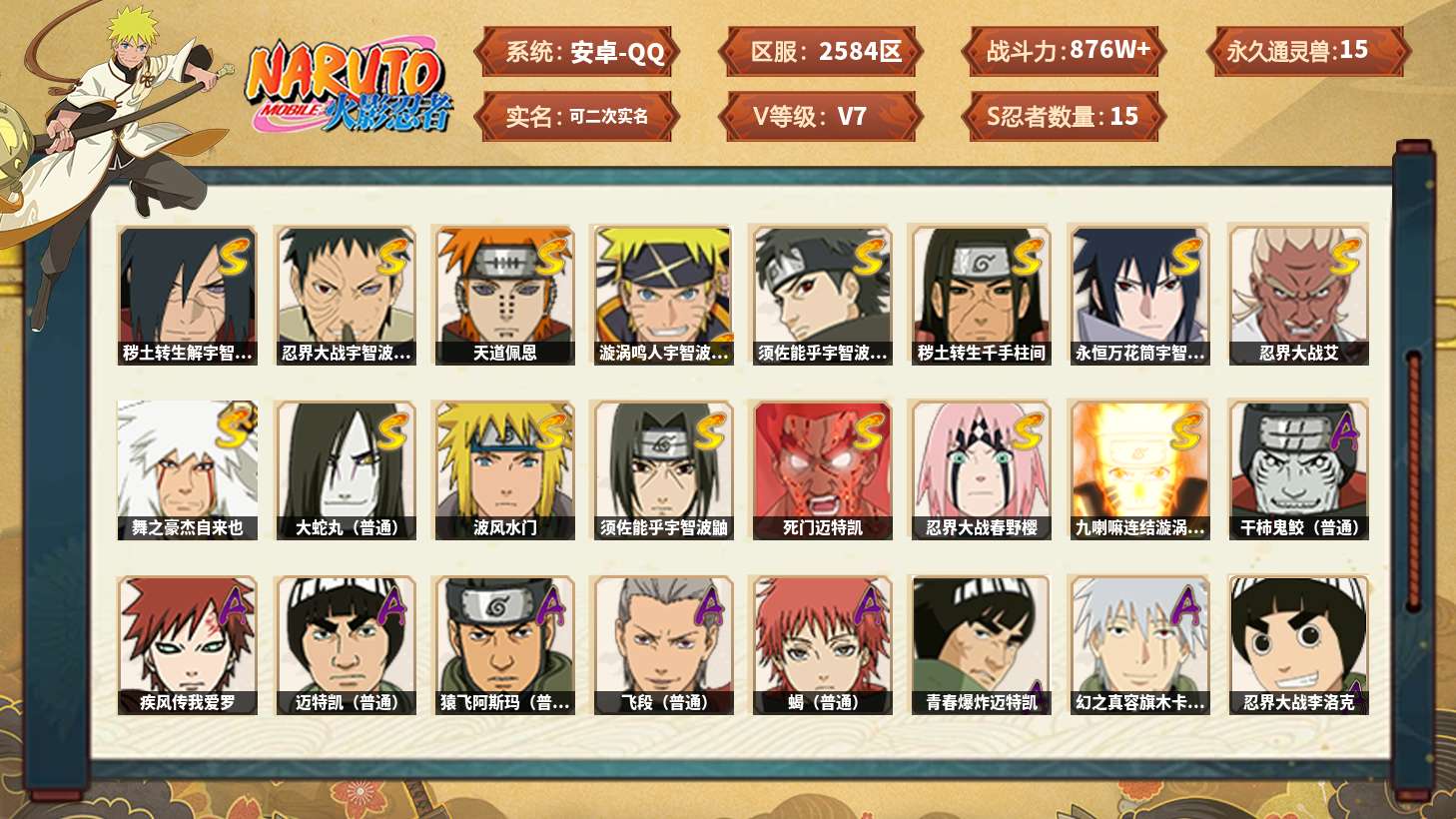 【火影忍者】【lyhy11086】战斗力:876w;段位:下忍3阶;本服排名:472;vip:v7级;s忍:15个;a忍:36个;通灵兽:15个,s忍:秽土转生解宇智波斑|忍界大战宇智波带土|天道佩恩|漩涡鸣人宇智波佐助|须佐能乎宇智波止水|秽土转生千手柱间|永恒万花筒宇智波佐助|忍界大战艾|舞之豪杰自来也|大蛇丸(普通)|波风水门|须佐能乎宇智波鼬|死门迈特凯|忍界大战春野樱|九喇嘛连结漩涡鸣人__a忍:青春爆炸迈特凯|幻之真容旗木卡卡西|忍界大战李洛克|忍界大战日向宁次|四代目土影黑土|青年长门|忍者之路神秘面具男|秽土转生迪达拉|青年波风水门|青年艾|近松十人卫千代|须佐能乎宇智波佐助|九尾查克拉漩涡鸣人|晓大蛇丸|百豪春野樱|忍界大战秋道丁次|忍界大战我爱罗|万花筒写轮眼宇智波佐助|五代目水影照美冥|五代目雷影达鲁伊|死司凭血飞段|疾风传我爱罗 4星|迪达拉(普通)|飞段(普通) 3星|仙人模式漩涡鸣人|迈特凯(普通) 4星|宇智波鼬(普通)|干柿鬼鲛(普通) 5星|蝎(普通) 3星|绯流琥蝎|猿飞阿斯玛(普通) 4星|桃式显现漩涡博人|六代目水影长十郎|不缘|不动|宇智波泉奈__通灵兽:忍犬(普通)|蓝蛇|砂之守鹤|蛤蟆吉|忍龟|镰鼬|猿魔|山椒鱼|蜃|蛤蟆仙人|鲛鲨|蛤蟆健|蛤蟆广|乌鸦(普通)|蛤蟆龙