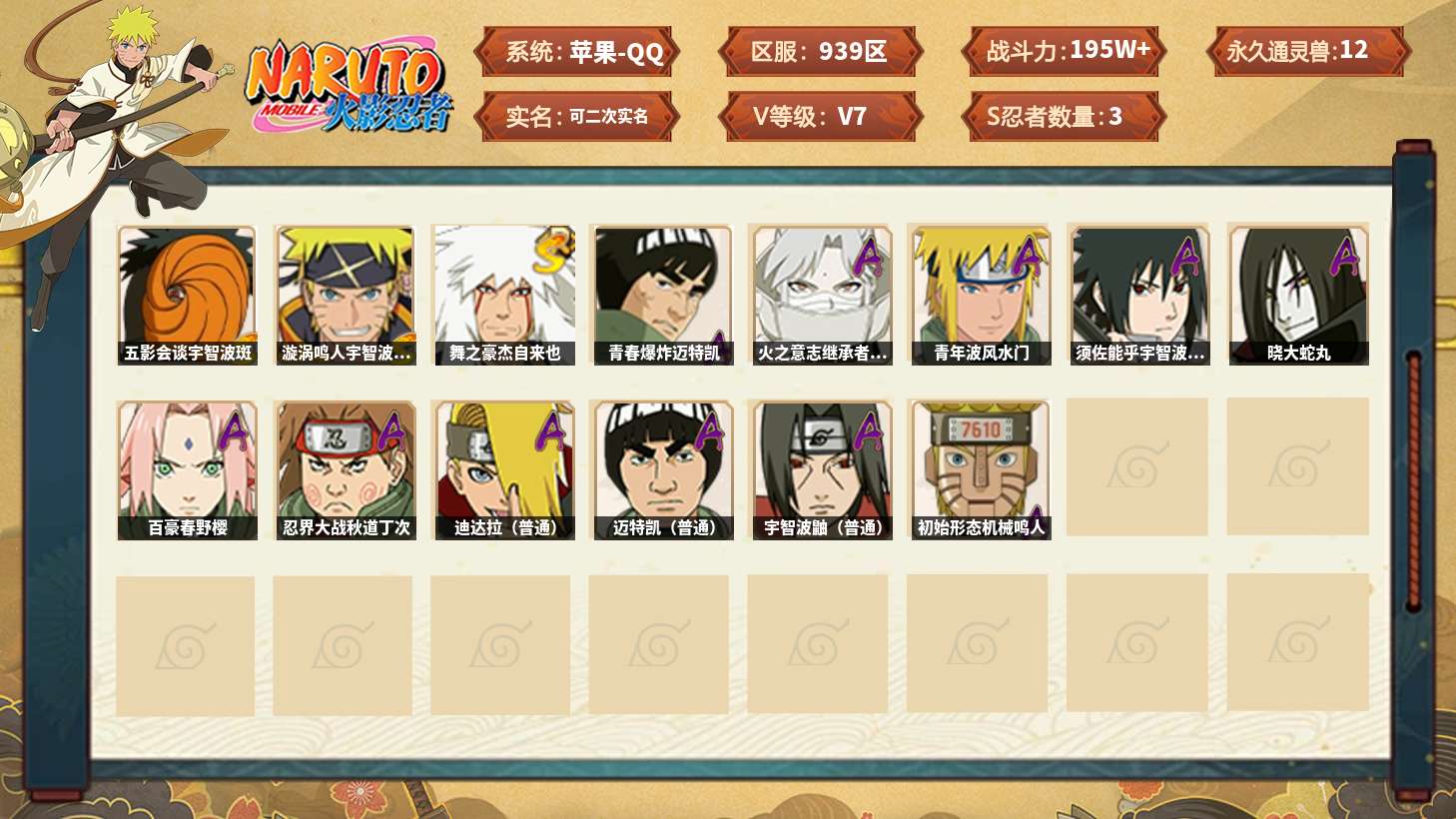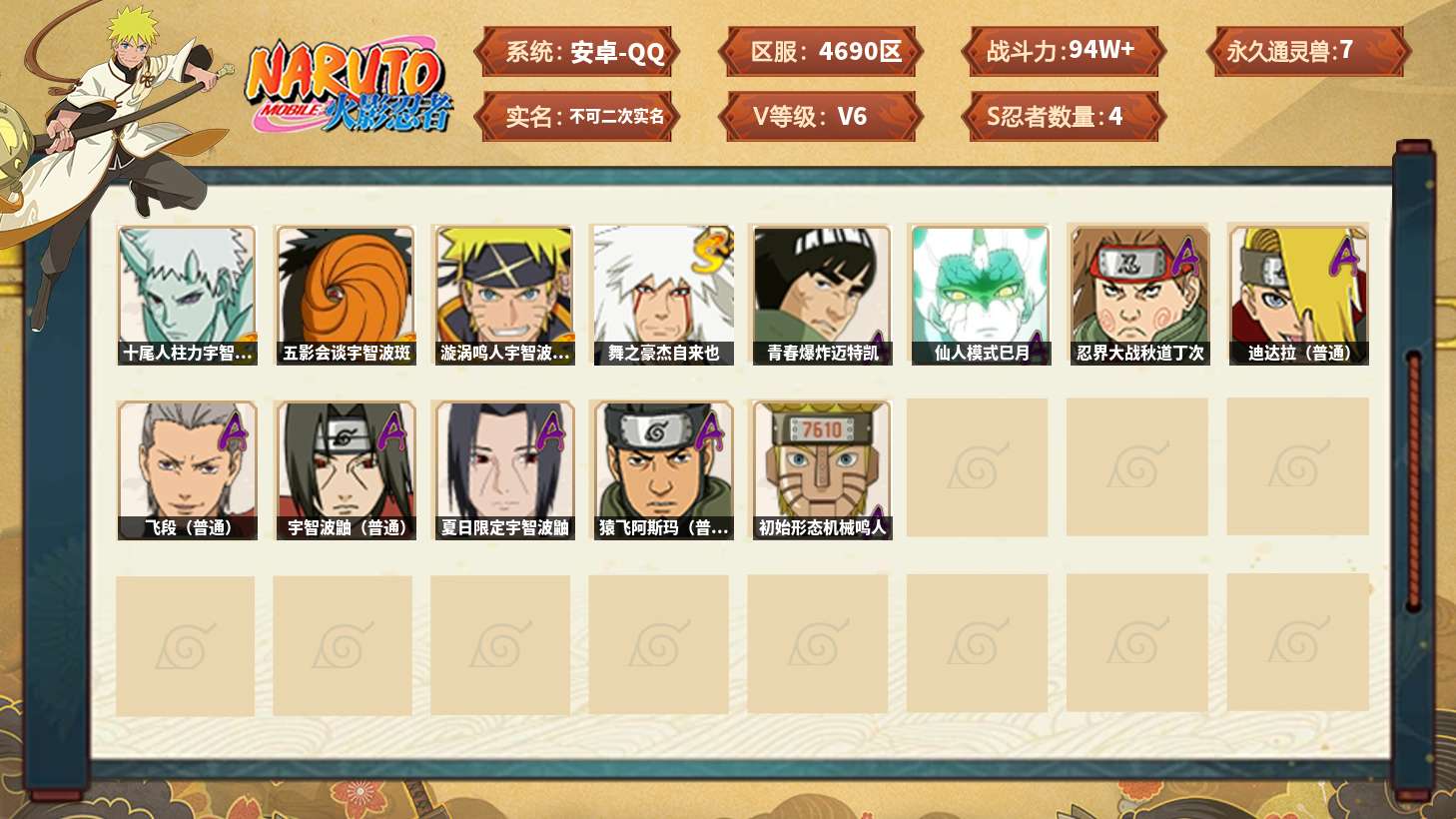 【火影忍者】【lyhy11089】战斗力:94w;段位:暗部3阶;vip:v6级;s忍:4个;a忍:9个;通灵兽:7个,s忍:十尾人柱力宇智波带土|五影会谈宇智波斑|漩涡鸣人宇智波佐助|舞之豪杰自来也__a忍:青春爆炸迈特凯|仙人模式巳月|忍界大战秋道丁次|迪达拉(普通)|飞段(普通)|宇智波鼬(普通)|夏日限定宇智波鼬|猿飞阿斯玛(普通)|初始形态机械鸣人__通灵兽:忍犬(普通)|蓝蛇|蛤蟆吉|忍龟|镰鼬|砂之守鹤|猿魔