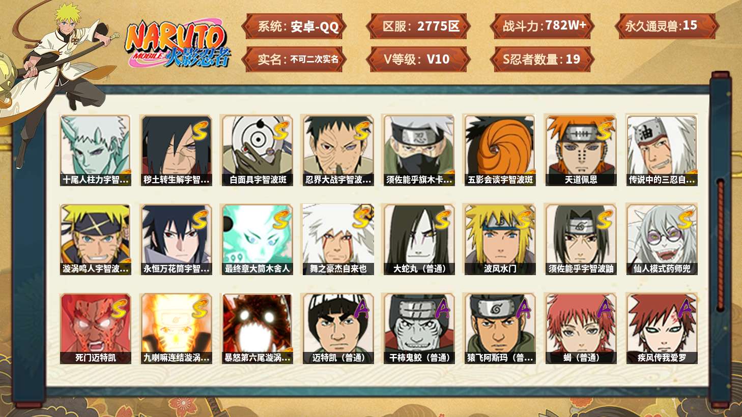 【火影忍者】【lyhy11081】战斗力:782w;段位:暗部2阶;本服排名:782;vip:v10级;s忍:19个;a忍:36个;通灵兽:15个,s忍:十尾人柱力宇智波带土|秽土转生解宇智波斑|白面具宇智波斑|忍界大战宇智波带土|须佐能乎旗木卡卡西|五影会谈宇智波斑|天道佩恩|传说中的三忍自来也|漩涡鸣人宇智波佐助|永恒万花筒宇智波佐助|最终章大筒木舍人|舞之豪杰自来也|大蛇丸(普通)|波风水门|须佐能乎宇智波鼬|仙人模式药师兜|死门迈特凯|九喇嘛连结漩涡鸣人|暴怒第六尾漩涡鸣人__a忍:青春爆炸迈特凯|仙人模式巳月|幻之真容旗木卡卡西|秽土转生角都|忍界大战日向宁次|四代目土影黑土|青年长门|秽土转生迪达拉|青年波风水门|青年艾|近松十人卫千代|须佐能乎宇智波佐助|百豪春野樱|忍界大战秋道丁次|新春限定宇智波鼬|奇拉比(普通)|万花筒写轮眼宇智波佐助|五代目雷影达鲁伊|死司凭血飞段|疾风传我爱罗 3星|迪达拉(普通)|飞段(普通) 3星|迈特凯(普通) 5星|宇智波鼬(普通)|夏日限定宇智波鼬|干柿鬼鲛(普通) 5星|秽土转生桃地再不斩|蝎(普通) 4星|绯流琥蝎|猿飞阿斯玛(普通) 5星|桃式显现漩涡博人|六代目水影长十郎|新春限定大蛇丸|宇智波泉奈|羁绊神农|初始形态机械鸣人__通灵兽:忍犬(普通)|蓝蛇|砂之守鹤|蛤蟆吉|忍龟|镰鼬|猿魔|山椒鱼|蜃|蛤蟆仙人|鲛鲨|蛤蟆健|乌鸦(普通)|蛤蟆龙|蛤蟆广