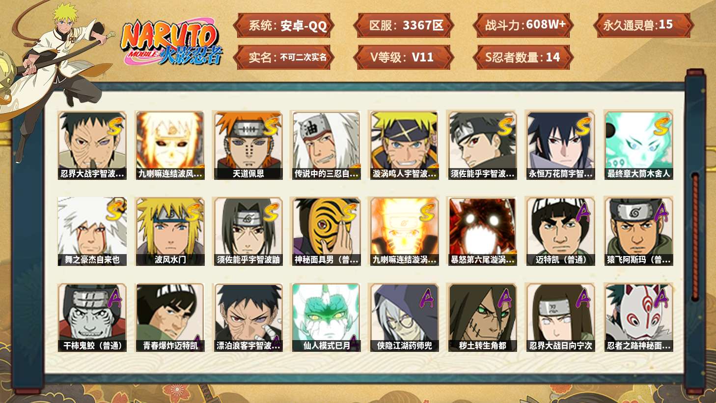 【火影忍者】【lyhy11088】战斗力:608w;段位:上忍3阶;本服排名:1002;vip:v11级;s忍:14个;a忍:30个;通灵兽:15个,s忍:忍界大战宇智波带土|九喇嘛连结波风水门|天道佩恩|传说中的三忍自来也|漩涡鸣人宇智波佐助|须佐能乎宇智波止水|永恒万花筒宇智波佐助|最终章大筒木舍人|舞之豪杰自来也|波风水门|须佐能乎宇智波鼬|神秘面具男(普通)|九喇嘛连结漩涡鸣人|暴怒第六尾漩涡鸣人__a忍:青春爆炸迈特凯|漂泊浪客宇智波带土|仙人模式巳月|侠隐江湖药师兜|秽土转生角都|忍界大战日向宁次|忍者之路神秘面具男|不风|近松十人卫千代|半蛇斗篷药师兜|九尾查克拉漩涡鸣人|忍界大战秋道丁次|新春限定波风水门|死司凭血飞段|疾风传我爱罗|迪达拉(普通)|飞段(普通)|迈特凯(普通) 5星|宇智波鼬(普通)|夏日限定宇智波鼬|干柿鬼鲛(普通) 3星|绯流琥蝎|蝎(普通)|猿飞阿斯玛(普通) 4星|桃式显现漩涡博人|不缘|宇智波泉奈|羁绊神农|初始形态机械鸣人|侠隐江湖大野木__通灵兽:忍犬(普通)|蓝蛇|蛤蟆吉|忍龟|砂之守鹤|镰鼬|猿魔|山椒鱼|蜃|蛤蟆仙人|鲛鲨|蛤蟆健|蛞蝓(普通)|乌鸦(普通)|蛤蟆龙