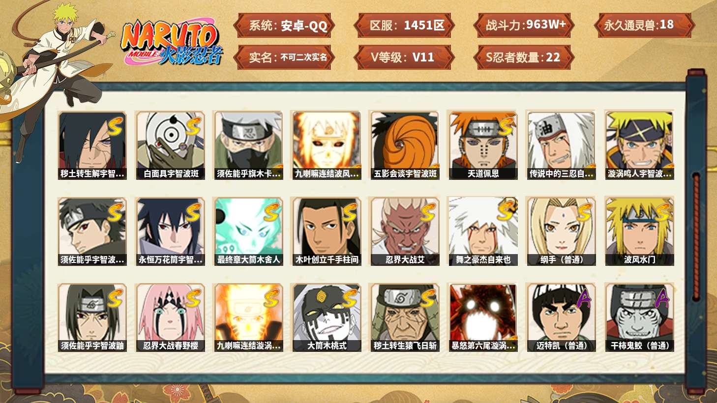 【火影忍者】【lyhy11087】战斗力:492w;段位:中忍1阶;本服排名:2742;vip:v7级;s忍:7个;a忍:22个;通灵兽:13个,s忍:永恒万花筒宇智波佐助|舞之豪杰自来也|波风水门|须佐能乎宇智波鼬 4星|忍界大战春野樱|九喇嘛连结漩涡鸣人|博人传大筒木金式__a忍:幻之真容旗木卡卡西|青年长门|宇智波止水(普通)|青年波风水门|青年艾|忍界大战旗木卡卡西|近松十人卫千代|九尾查克拉漩涡鸣人|奇拉比(普通)|死司凭血飞段|疾风传我爱罗|迪达拉(普通)|飞段(普通)|迈特凯(普通) 3星|宇智波鼬(普通)|干柿鬼鲛(普通) 3星|桃地再不斩|蝎(普通)|猿飞阿斯玛(普通)|六代目水影长十郎|不缘|宇智波泉奈__通灵兽:忍犬(普通)|蓝蛇|蛤蟆吉|忍龟|镰鼬|猿魔|山椒鱼|蜃|砂之守鹤|蛤蟆仙人|鲛鲨|蛤蟆健|乌鸦(普通)