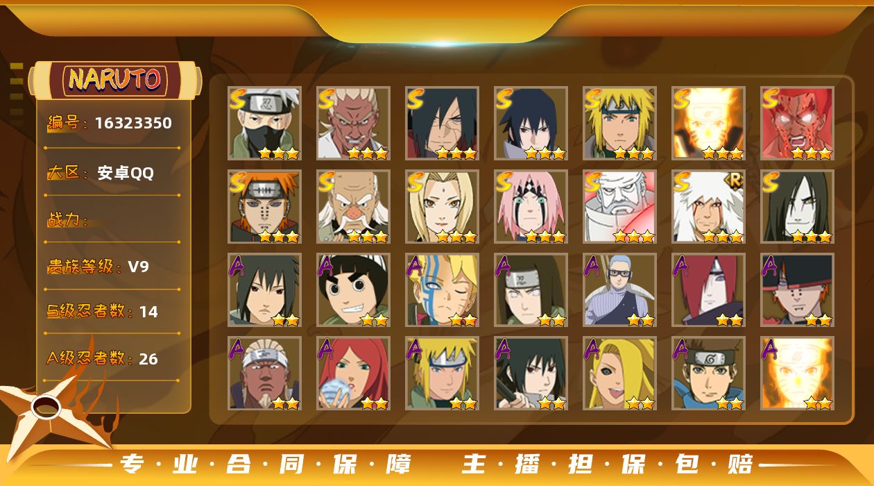 【区服】4355【等级】128【s级数量】5【a级数量】16【b级数量】27【c级数量】33【s级】自来也「舞之豪杰」 宇智波鼬「须佐能乎」 漩涡鸣人「九喇嘛连结」 漩涡鸣人·宇智波佐助 波风水门「九喇嘛连结」【a级】飞段 宇智波鼬 桃地再不斩「秽土转生」 大蛇丸「晓」 干柿鬼鲛 迪达拉 宇智波泉奈 迈特凯「青春爆炸」 宇智波佐助「须佐能乎」 猿飞阿斯玛 长十郎「六代目水影」