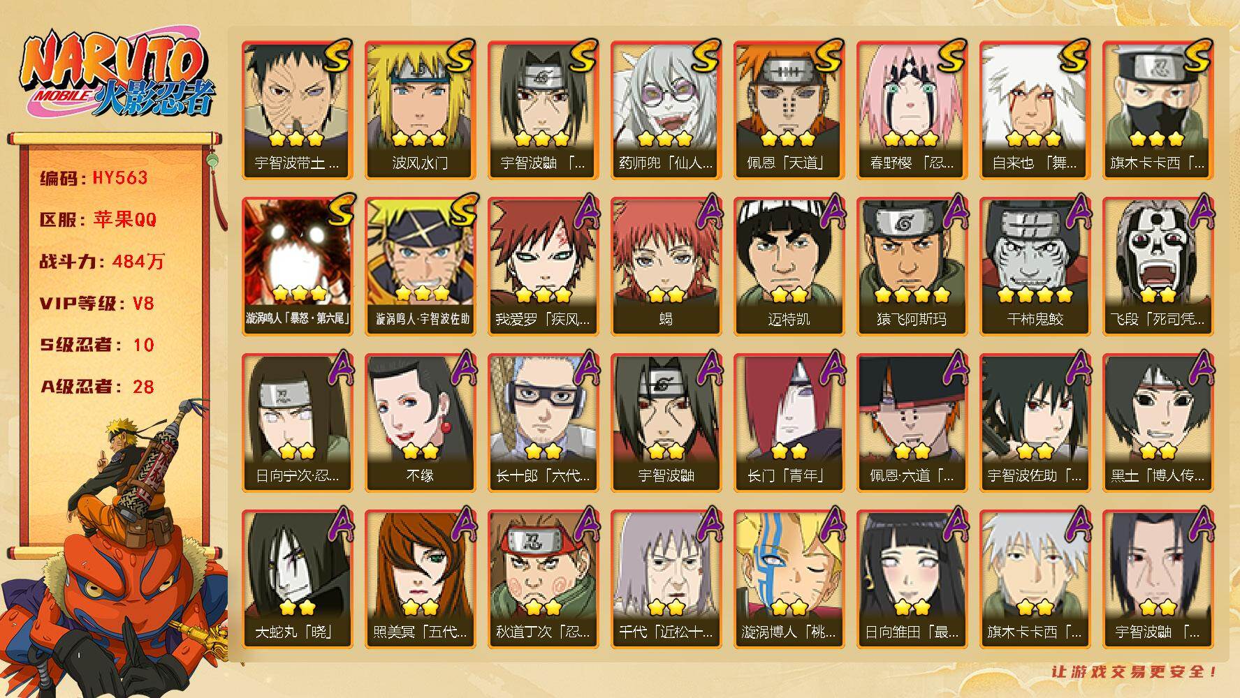 【s忍者3 a忍者8 通灵9】【苹果q-942区-89级-v1-142万战力】【s级】千手扉间「秽土转生」 漩涡鸣人·宇智波佐助 自来也「舞之豪杰」【a级】旗木卡卡西「幻之真容」 猿飞阿斯玛 宇智波鼬 干柿鬼鲛 迪达拉 旗木卡卡西「忍界大战」 迈特凯「青春爆炸」 土台「忍界大战」【b级】佩恩「畜生道」 君麻吕 漩涡鸣人「疾风传」 鬼灯满月「忍刀七人众」 御手洗红豆 夕日红 天天