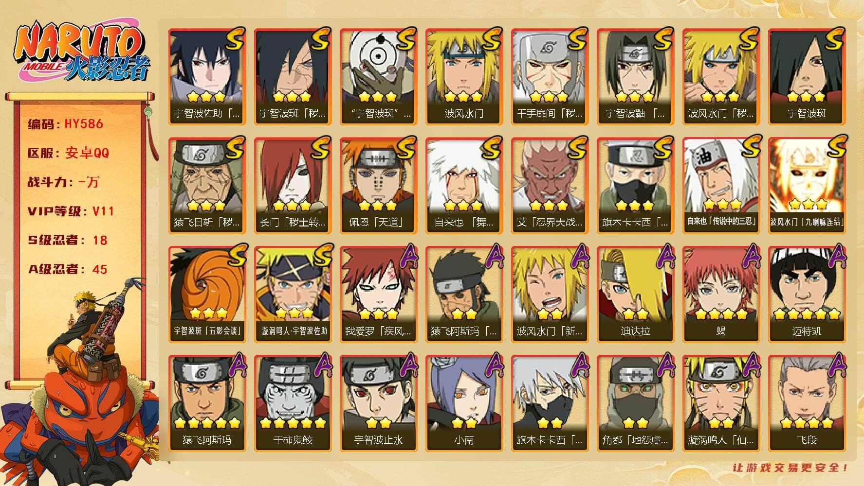 【s忍者4 a忍者16 通灵14】【安卓q-4518区-113级-v4-318万战力】【s级】自来也「舞之豪杰」 宇智波鼬「须佐能乎」 宇智波斑「秽土转生·解」 漩涡鸣人·宇智波佐助【a级】迈特凯 漩涡鸣人「九尾查克拉」 迈特凯「青春爆炸」 迪达拉 干柿鬼鲛 宇智波鼬 药师兜「半蛇斗篷」 土台「忍界大战」 蝎 达鲁伊「五代目雷影」 机械鸣人「初始形态」 不动 猿飞阿斯玛 飞段