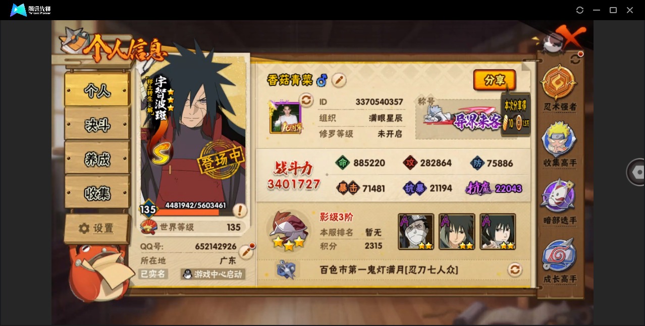 v5 13s忍 28a忍 15通灵 649.1w战力 可二次 可修改实名 【s级忍者】宇智波斑「秽土转生·解」宇智波佐助「永恒万花筒」漩涡鸣人 「九喇嘛连结」千手柱间「秽土转生」自来也 「舞之豪杰」波风水门「九喇嘛连结」宇智波鼬「秽土转生」宇智波斑「白面具」宇智波鼬 「须佐能乎」