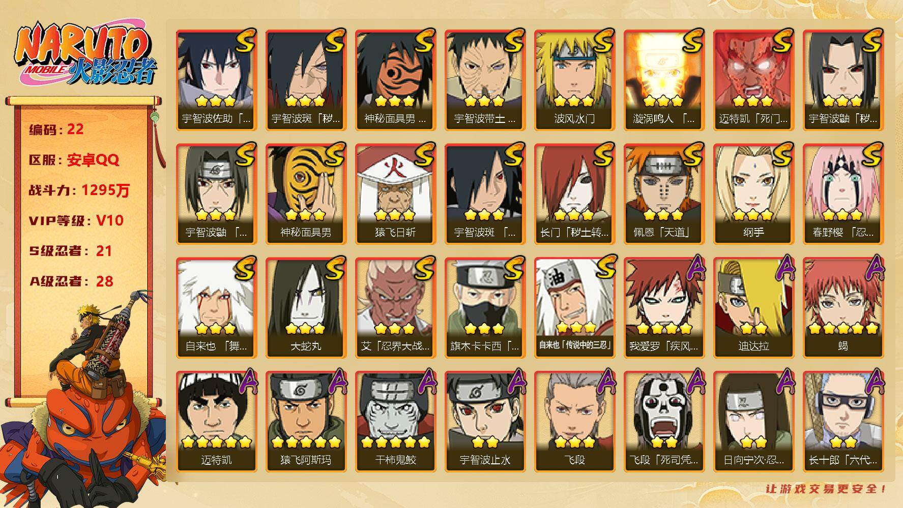 v10/战力1295w/s忍21/a忍28 3星宇智波佐助「永恒万花筒」3星宇智波斑「秽土转生·解」3星神秘面具男「红夜之刃」3星宇智波带土「忍界大战」3星波风水门3星漩涡鸣人「九喇嘛连结」3星迈特凯「死门」3星宇智波鼬「秽土转生」3星宇智波鼬「须佐能乎」3星神秘面具男3星猿飞日斩3星宇智波斑「木叶创立」3星长门「秽土转生」3星佩恩「天道」3星纲手3星春野樱「忍界大战」3星自来也「舞之豪杰」3星大蛇丸3星艾「忍界大战」3星旗木卡卡西「须佐能乎」3星自来也「传说中的三忍」4星我爱罗「疾风传」2星迪达拉5星蝎5星迈特凯5星猿飞阿斯玛5星干柿鬼鲛2星宇智波止水3星飞段2星飞段「死司凭血」2星日向宁次「忍界大战」2星长十郎「六代目水影」2星不风2星宇智波鼬2星艾「青年」2星波风水门「青年」2星神秘面具男「忍者之路」2星宇智波佐助「万花筒写轮眼」2星照美冥「五代目水影」2星秋道丁次「忍界大战」2星千代「近松十人卫」2星宇智波佐助「疾风传咒印」2星漩涡博人「桃式显现」2星日向雏田「最终章」2星旗木卡卡西「幻之真容」2星李洛克「忍界大战」2星宇智波泉奈2星蝎「绯流琥」
