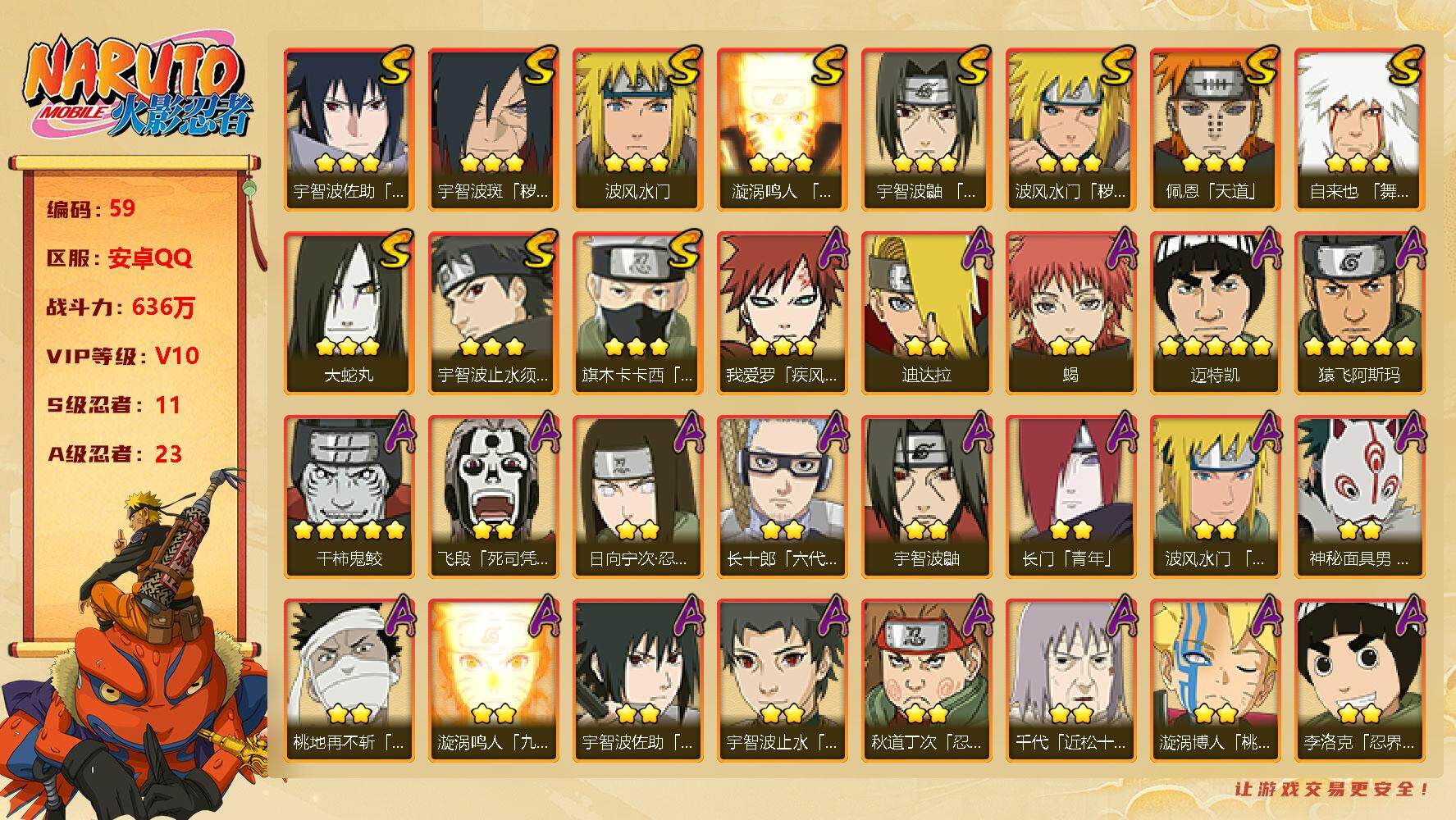 v8/战力659w/s忍15/a忍32 3星宇智波佐助「永恒万花筒」3星宇智波斑「秽土转生·解」3星波风水门3星宇智波斑「秽土转生」3星宇智波鼬「须佐能乎」3星千手柱间「秽土转生」3星波风水门「秽土转生」3星猿飞日斩「秽土转生」3星纲手「百豪」3星药师兜「仙人模式」3星长门「秽土转生」3星佩恩「天道」3星自来也「舞之豪杰」3星旗木卡卡西「须佐能乎」3星大筒木舍人「最终章」3星我爱罗「疾风传」3星蝎5星迈特凯4星猿飞阿斯玛5星干柿鬼鲛2星宇智波止水2星旗木卡卡西「万花筒写轮眼」2星角都「地怨虞」2星漩涡鸣人「仙人模式」4星飞段2星飞段「死司凭血」2星日向宁次「忍界大战」2星不缘2星长十郎「六代目水影」2星宇智波鼬2星宇智波佐助「万花筒写轮眼」2星迪达拉「秽土转生」2星漩涡鸣人「九尾查克拉」2星宇智波佐助「须佐能乎」2星大蛇丸「晓」2星秋道丁次「忍界大战」2星千代「近松十人卫」2星我爱罗「忍界大战」2星药师兜「半蛇斗篷」2星小南「漂泊浪客」2星漩涡博人「桃式显现」2星日向雏田「最终章」2星李洛克「忍界大战」2星宇智波泉奈2星角都「秽土转生」
