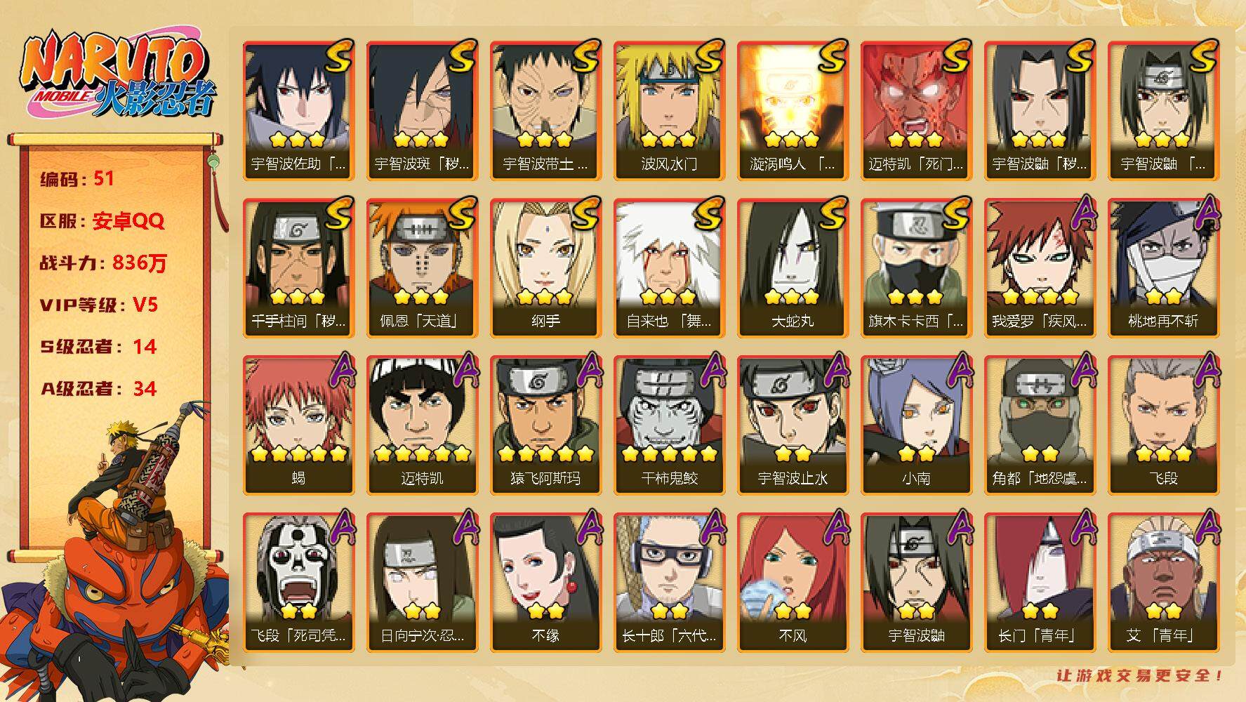 v5/战力836w/s忍14/a忍34 3星宇智波佐助「永恒万花筒」3星宇智波斑「秽土转生·解」3星宇智波带土「忍界大战」3星波风水门3星漩涡鸣人「九喇嘛连结」3星迈特凯「死门」3星宇智波鼬「秽土转生」3星宇智波鼬「须佐能乎」3星千手柱间「秽土转生」3星佩恩「天道」3星纲手3星自来也「舞之豪杰」3星大蛇丸3星旗木卡卡西「须佐能乎」4星我爱罗「疾风传」2星桃地再不斩5星蝎5星迈特凯5星猿飞阿斯玛5星干柿鬼鲛2星宇智波止水2星小南2星角都「地怨虞」3星飞段2星飞段「死司凭血」2星日向宁次「忍界大战」2星不缘2星长十郎「六代目水影」2星不风2星宇智波鼬2星长门「青年」2星艾「青年」2星波风水门「青年」2星奇拉比2星宇智波佐助「万花筒写轮眼」2星迪达拉「秽土转生」2星宇智波佐助「须佐能乎」2星秋道丁次「忍界大战」2星千代「近松十人卫」2星漩涡博人「桃式显现」2星日向雏田「最终章」2星旗木卡卡西「幻之真容」2星李洛克「忍界大战」2星宇智波泉奈2星蝎「绯流琥」2星不动