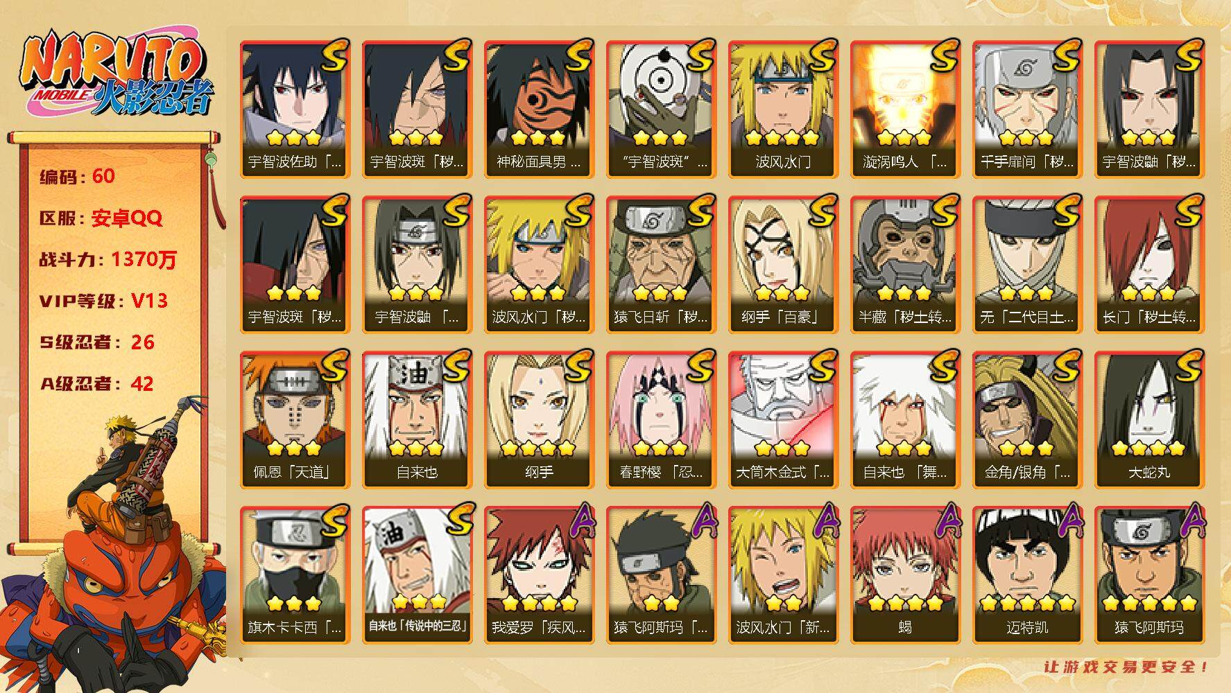 v13/战力1370w/s忍26/a忍42 3星宇智波佐助「永恒万花筒」3星宇智波斑「秽土转生·解」3星神秘面具男「红夜之刃」3星宇智波斑「白面具」4星波风水门3星漩涡鸣人「九喇嘛连结」3星千手扉间「秽土转生」3星宇智波鼬「秽土转生」3星宇智波斑「秽土转生」3星宇智波鼬「须佐能乎」3星波风水门「秽土转生」3星猿飞日斩「秽土转生」3星纲手「百豪」3星半藏「秽土转生」3星无「二代目土影」3星长门「秽土转生」3星佩恩「天道」3星自来也4星纲手3星春野樱「忍界大战」3星大筒木金式3星自来也「舞之豪杰」3星金角·银角「秽土转生」4星大蛇丸3星旗木卡卡西「须佐能乎」3星自来也「传说中的三忍」4星我爱罗「疾风传」2星猿飞阿斯玛「秽土转生」2星波风水门「新春限定」4星蝎5星迈特凯5星猿飞阿斯玛5星干柿鬼鲛2星小南2星旗木卡卡西「万花筒写轮眼」2星漩涡鸣人「仙人模式」4星飞段2星飞段「死司凭血」2星日向宁次「忍界大战」2星不缘2星长十郎「六代目水影」2星宇智波鼬2星长门「青年」2星艾「青年」2星波风水门「青年」2星奇拉比2星宇智波佐助「万花筒写轮眼」2星宇智波带土「暴怒」2星迪达拉「秽土转生」2星桃地再不斩「漂泊武士」2星漩涡鸣人「九尾查克拉」2星宇智波佐助「须佐能乎」2星大蛇丸「晓」2星照美冥「五代目水影」2星春野樱「百豪」2星秋道丁次「忍界大战」2星千代「近松十人卫」2星我爱罗「忍界大战」2星宇智波鼬「新春限定」2星药师兜「半蛇斗篷」2星日向雏田「最终章」2星药师兜「侠影江湖」2星李洛克「忍界大战」2星宇智波泉奈2星宇智波带土「漂泊浪客」2星桃地再不斩「秽土转生」