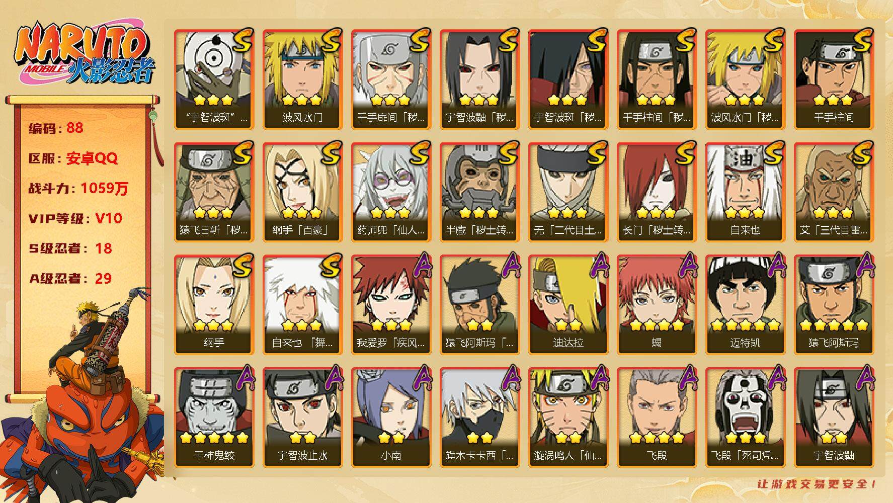 v10/战力1059w/s忍18/a忍29 3星宇智波斑「白面具」3星波风水门3星千手扉间「秽土转生」3星宇智波鼬「秽土转生」3星宇智波斑「秽土转生」3星千手柱间「秽土转生」3星波风水门「秽土转生」3星千手柱间3星猿飞日斩「秽土转生」3星纲手「百豪」3星药师兜「仙人模式」3星半藏「秽土转生」3星无「二代目土影」3星长门「秽土转生」3星自来也3星艾「三代目雷影」3星纲手3星自来也「舞之豪杰」3星我爱罗「疾风传」2星猿飞阿斯玛「秽土转生」2星迪达拉4星蝎5星迈特凯5星猿飞阿斯玛5星干柿鬼鲛2星宇智波止水2星小南2星旗木卡卡西「万花筒写轮眼」2星漩涡鸣人「仙人模式」4星飞段3星飞段「死司凭血」2星宇智波鼬2星波风水门「青年」2星迪达拉「秽土转生」2星漩涡鸣人「九尾查克拉」2星宇智波佐助「须佐能乎」2星奇拉比「忍界大战」2星大蛇丸「晓」2星照美冥「五代目水影」2星秋道丁次「忍界大战」2星千代「近松十人卫」2星小南「夏日泳装」2星我爱罗「忍界大战」2星宇智波鼬「新春限定」3星药师兜「半蛇斗篷」