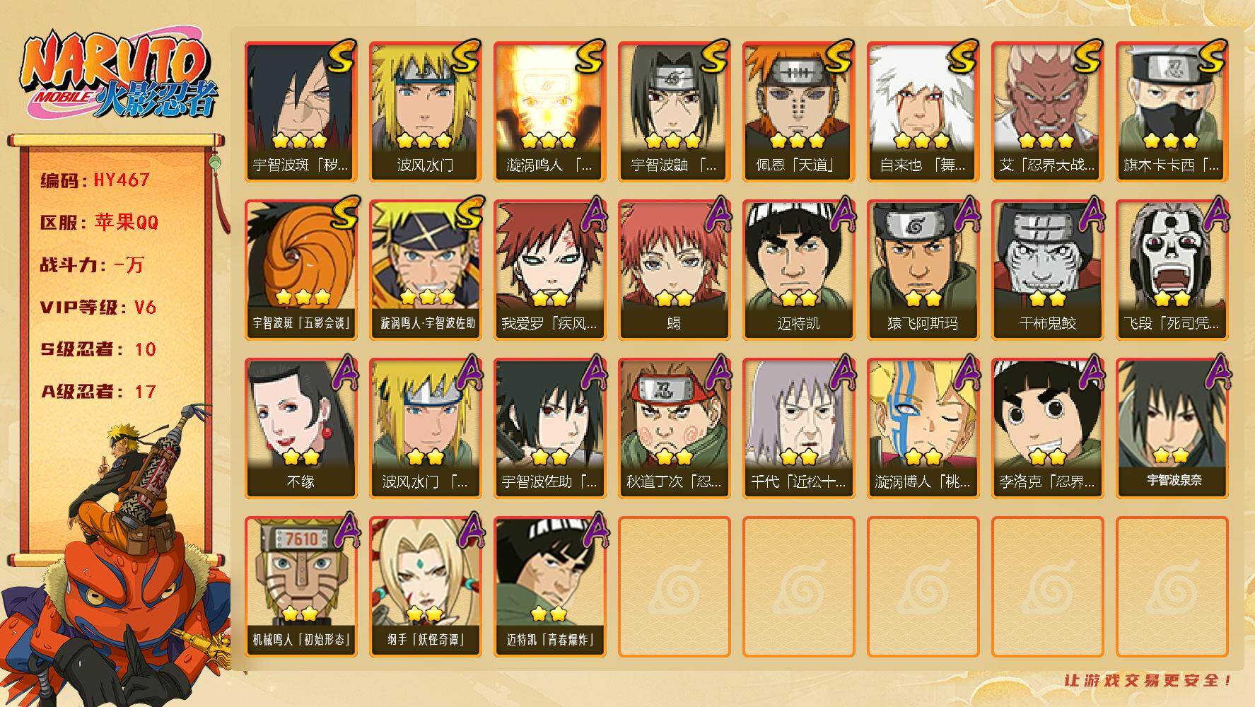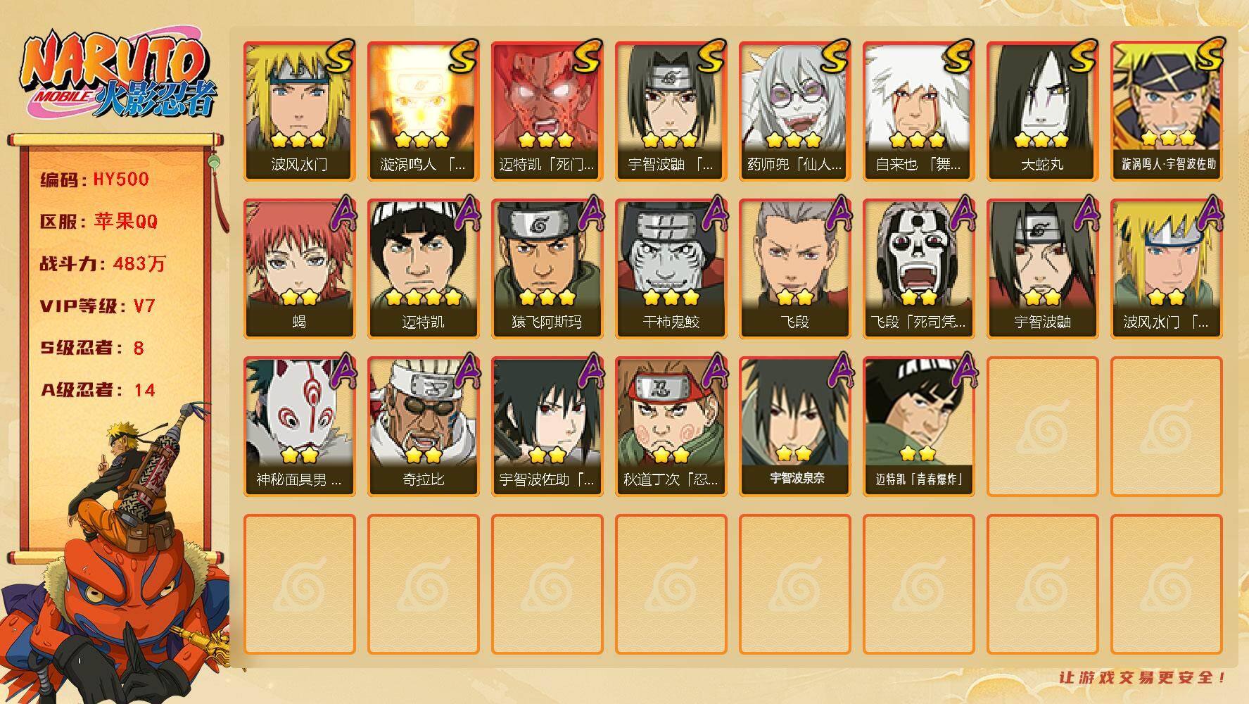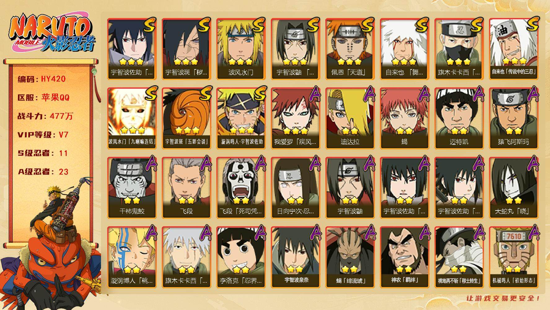 【编号15895可秒换绑】【店长推荐精品号】【商品标题】:8s级忍者数-16a级忍者数 【s级忍者】:宇智波斑「秽土转生·解」3星,宇智波带土「忍界大战」3星,艾「忍界大战」3星,宇智波止水「须佐能乎」3星,自来也「舞之豪杰」3星,波风水门3星,佩恩「天道」3星,宇智波斑 「白面具」3星宇智波斑「白面具」 【a级忍者】:波风水门「青年」2星,迪达拉2星,飞段「死司凭血」2星,干柿鬼鲛4星,漩涡博人「桃式显现」2星,迈特凯4星,旗木卡卡西「幻之真容」2星,我爱罗「疾风传」2星,蝎2星,猿飞阿斯玛4星,宇智波鼬2星,宇智波佐助「须佐能乎」2星,日向宁次「忍界大战」2星,李洛克「忍界大战」2星,秋道丁次「忍界大战」2星,不缘2星