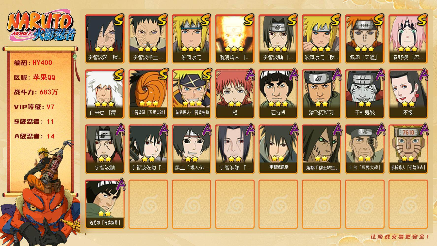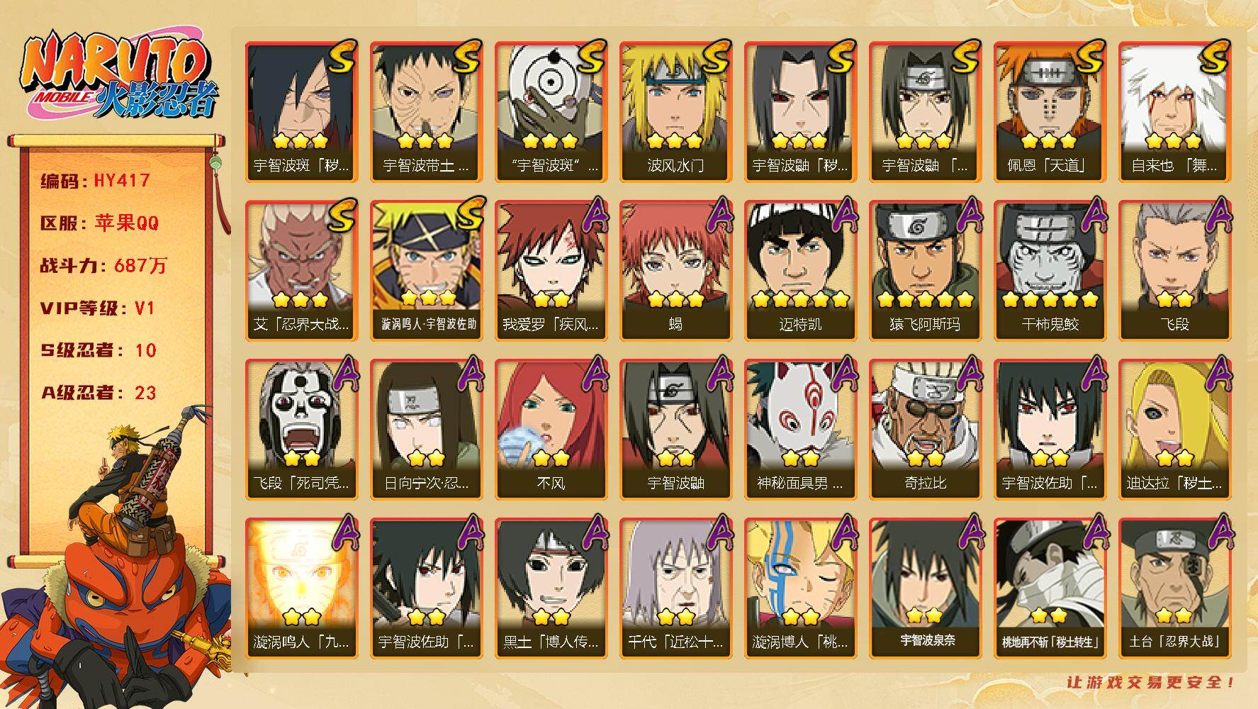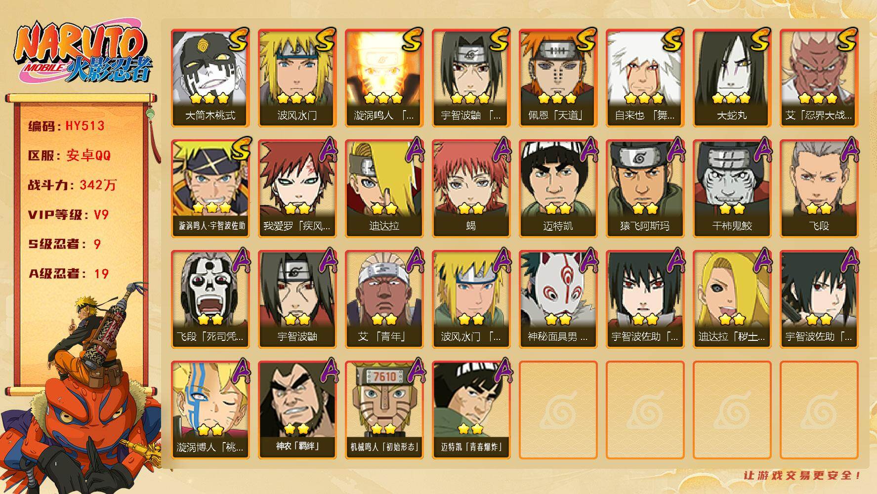 【编号15895可秒换绑】【店长推荐精品号】【商品标题】:8s级忍者数-16a级忍者数 【s级忍者】:宇智波斑「秽土转生·解」3星,宇智波带土「忍界大战」3星,艾「忍界大战」3星,宇智波止水「须佐能乎」3星,自来也「舞之豪杰」3星,波风水门3星,佩恩「天道」3星,宇智波斑 「白面具」3星宇智波斑「白面具」 【a级忍者】:波风水门「青年」2星,迪达拉2星,飞段「死司凭血」2星,干柿鬼鲛4星,漩涡博人「桃式显现」2星,迈特凯4星,旗木卡卡西「幻之真容」2星,我爱罗「疾风传」2星,蝎2星,猿飞阿斯玛4星,宇智波鼬2星,宇智波佐助「须佐能乎」2星,日向宁次「忍界大战」2星,李洛克「忍界大战」2星,秋道丁次「忍界大战」2星,不缘2星