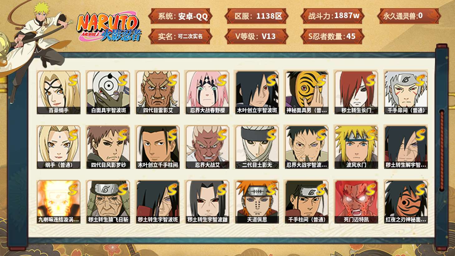 【hysa1085】v8/战力703w/s忍16/a忍29/通灵兽18/秽土斑/博人传达鲁伊/死司飞段/宇智波鼬/秽土鼬/2星长门「青年」/忍战带土/3星飞段/宇智波斑/2星蝎/秽土日斩/佩恩/3星漩涡鸣人·宇智波佐助/波风水门/忍战丁次/秽土扉间/3星干柿鬼鲛/秽土柱间/3星我爱罗「疾风传」/2星土台「忍界大战」/青年水门/豪杰自来也/漂泊扉间/百豪樱/白面具/死门凯/漂泊六道/暴怒带土/博
