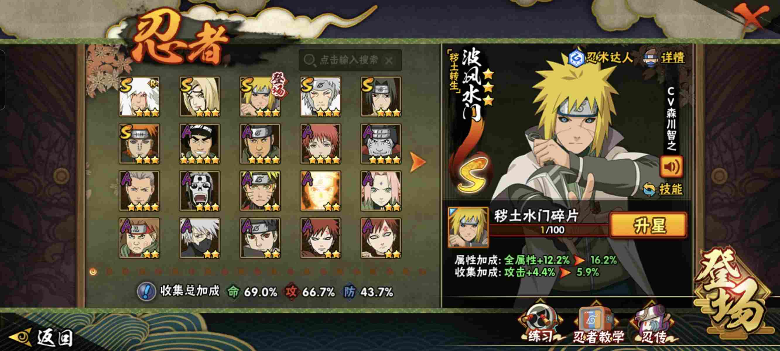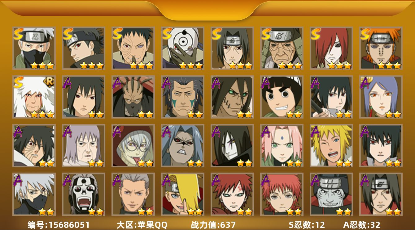 [15686051]v11,战力637w12s级忍者数-32a级忍者数,十尾带土73片,最终章舍人80片,天道超84片,热门a忍侠隐大野木,卑留呼,漂泊带土,暴怒带土,新春小南,新春水门等,me2047 【s级忍者】:长门「秽土转生」3星,猿飞日斩「秽土转生」3星,宇智波带土「忍界大战」3星,宇智波鼬「须佐能乎」3星,宇智波止水「须佐能乎」3星,旗木卡卡西「须佐能乎」3星,自来也「舞之豪杰」3星,自来也「传说中的三忍」3星,佩恩「天道」3星,宇智波斑 「白面具」3星宇智波斑「白面具」,宇智波斑「五影会谈」3星,漩涡鸣人·宇智波佐助3星 【a级忍者】:波风水门「新春限定」2星,迪达拉2星,大蛇丸「晓」2星,飞段2星,飞段「死司凭血」2星,干柿鬼鲛4星,机械鸣人「初始形态」2星,迈特凯5星,旗木卡卡西「万花筒写轮眼」2星,桃地再不斩「秽土转生」2星,我爱罗「疾风传」2星,蝎2星,蝎「绯流琥」2星,小南「新春限定」2星,角都「秽土转生」2星,猿飞阿斯玛4星,宇智波鼬2星,宇智波佐助「须佐能乎」2星,宇智波佐助「疾风传咒印」2星,宇智波佐助「万花筒写轮眼」2星,药师兜「半蛇斗篷」2星,宇智波带土「暴怒」2星,宇智波带土「漂泊浪客」2星,卑留呼「火之意志继承者」2星,李洛克「忍界大战」2星,黑土「博人传」2星,春野樱「百豪」2星,千代「近松十人卫」2星,宇智波泉奈2星,不动2星,大野木「侠隐江湖」2星,迈特凯「青春爆炸」2星