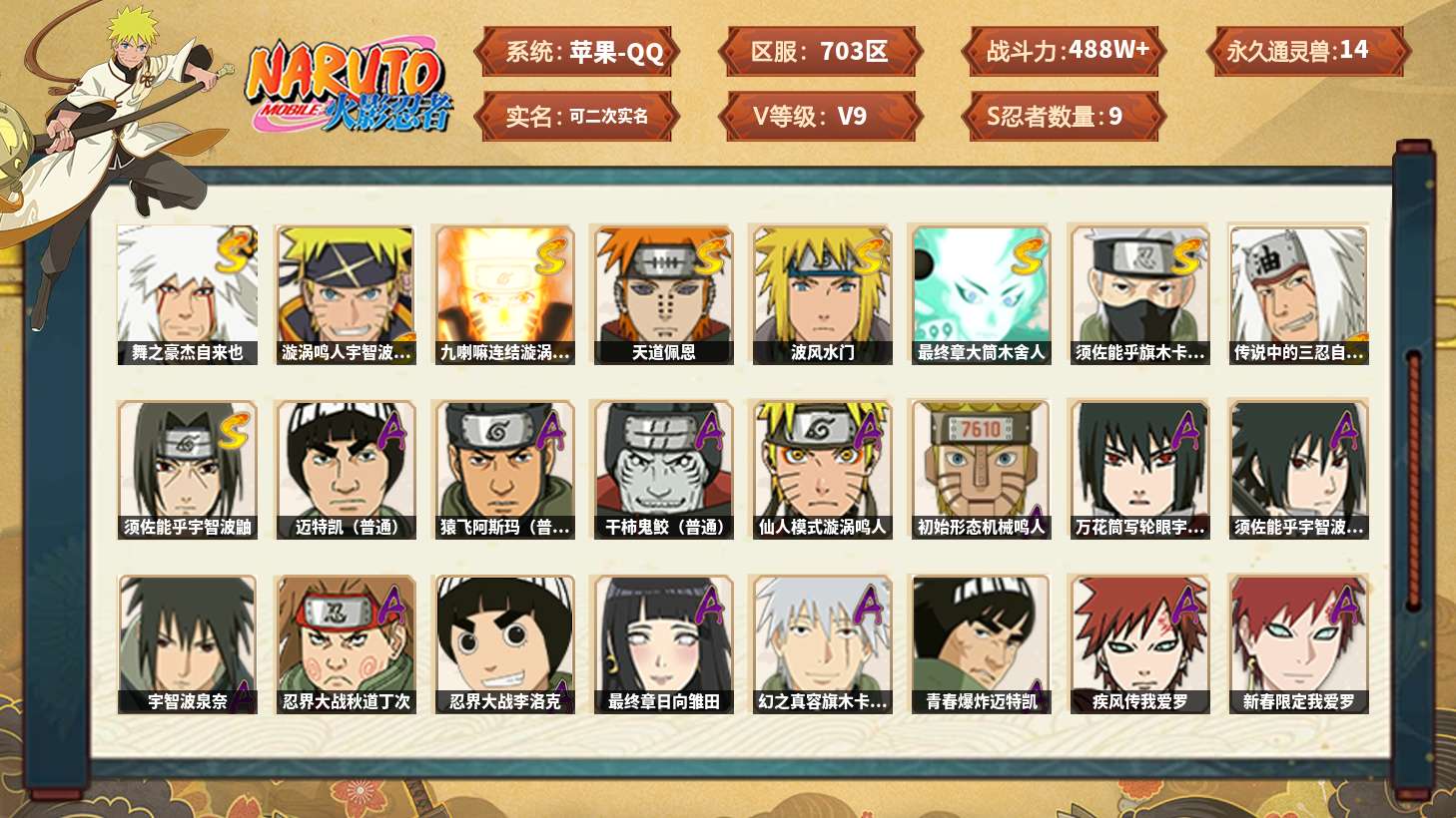 【火影忍者】【lyhy10068】战斗力:488w;段位:中忍3阶;vip:v9级;s忍:9个;a忍:25个;通灵兽:14个,s忍:舞之豪杰自来也|漩涡鸣人宇智波佐助|九喇嘛连结漩涡鸣人|天道佩恩|波风水门|最终章大筒木舍人|须佐能乎旗木卡卡西|传说中的三忍自来也|须佐能乎宇智波鼬__a忍:迈特凯(普通)|猿飞阿斯玛(普通)|干柿鬼鲛(普通)|仙人模式漩涡鸣人|初始形态机械鸣人|万花筒写轮眼宇智波佐助|须佐能乎宇智波佐助|宇智波泉奈|忍界大战秋道丁次|忍界大战李洛克|最终章日向雏田|幻之真容旗木卡卡西|青春爆炸迈特凯|疾风传我爱罗|新春限定我爱罗|近松十人卫千代|侠隐江湖药师兜|不缘|秽土转生角都|蝎(普通)|夏日限定宇智波鼬|迪达拉(普通)|飞段(普通)|死司凭血飞段|桃式显现漩涡博人__通灵兽:忍犬(普通)|蓝蛇|蛤蟆吉|忍龟|镰鼬|砂之守鹤|猿魔|山椒鱼|蜃|蛤蟆仙人|鲛鲨|蛤蟆健|乌鸦(普通)|蛞蝓(普通)