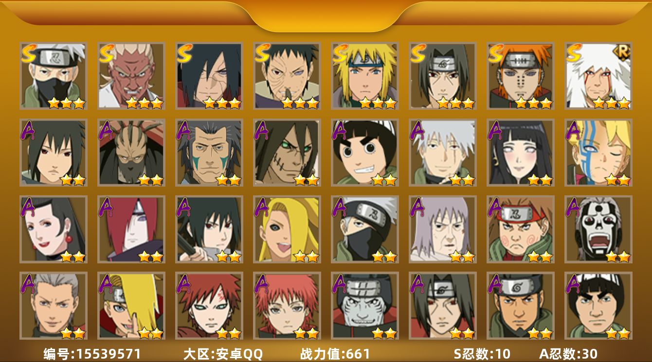 安卓q【区服】3892【等级】127【s级数量】5【a级数量】22【b级数量】42【c级数量】39【s级】 宇智波斑「秽土转生·解」 佩恩「天道」 自来也「舞之豪杰」 漩涡鸣人·宇智波佐助 宇智波鼬「须佐能乎」 【a级】 迈特凯「青春爆炸」 千代「近松十人卫」 不动 机械鸣人「初始形态」 长十郎「六代目水影」 迪达拉 干柿鬼鲛 猿飞阿斯玛 宇智波鼬「夏日限定」 迈特凯 宇智波泉奈 漩涡鸣人「九尾查