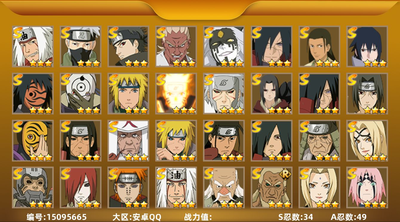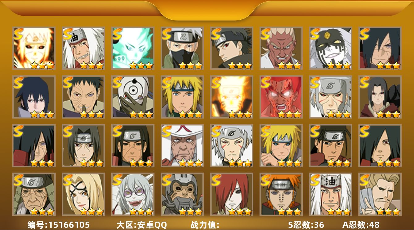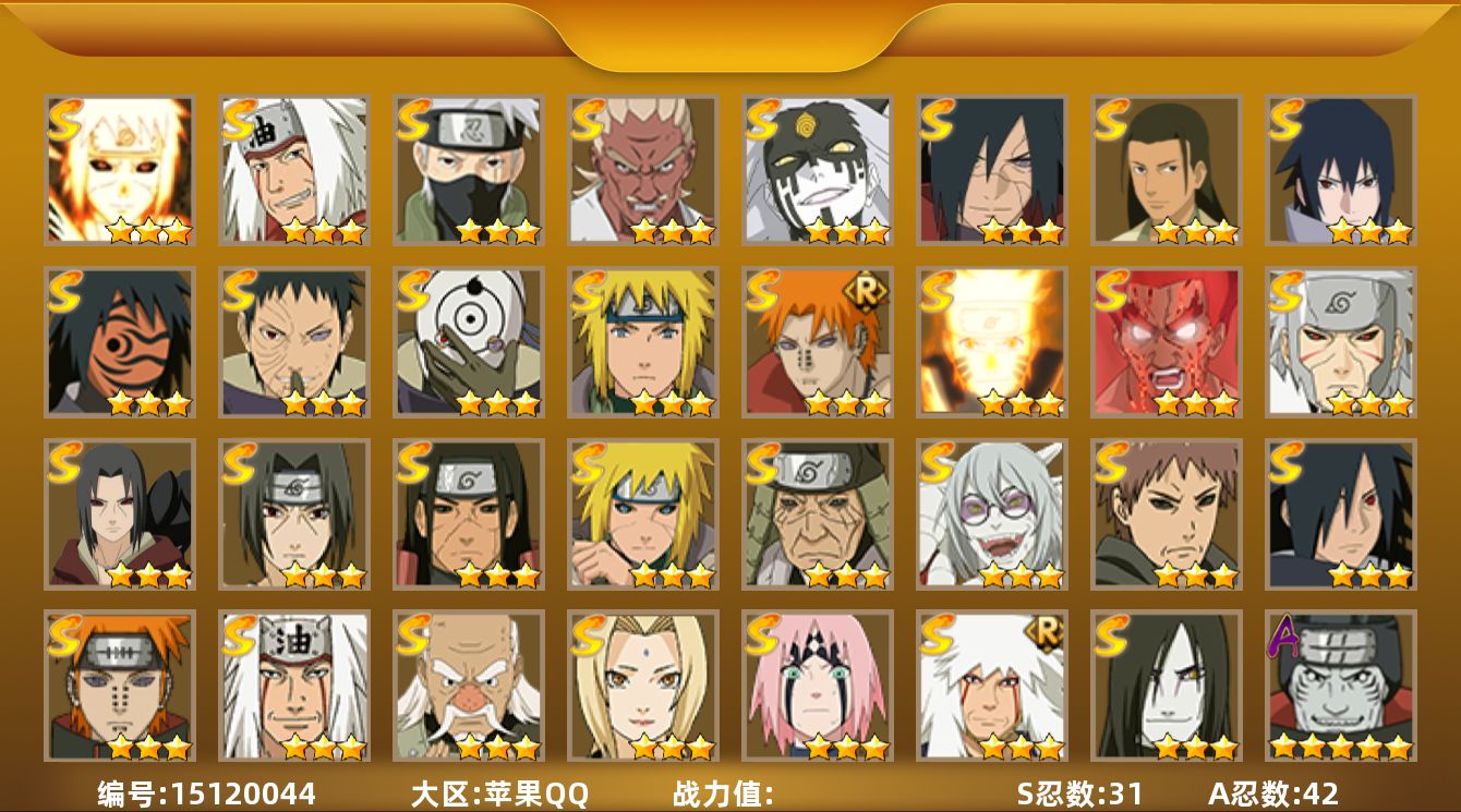 【区服】896【等级】126【s级数量】5【a级数量】13 【s级】自来也「舞之豪杰」 宇智波鼬「须佐能乎」 自来也「传说中的三忍」 漩涡鸣人·宇智波佐助 千手柱间「秽土转生」 【a级】机械鸣人「初始形态」 旗木卡卡西「幻之真容」 猿飞阿斯玛 神农「羁绊」 桃地再不斩「秽土转生」 飞段 迈特凯 迪达拉 迈特凯「青春爆炸」 干柿鬼鲛 纲手「妖怪奇谭」 宇智波鼬 宇智波佐助「须佐能乎」 【b级】佩恩「