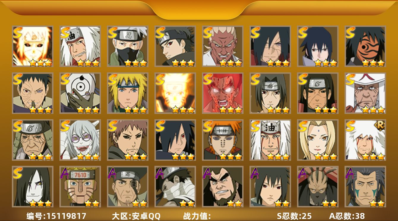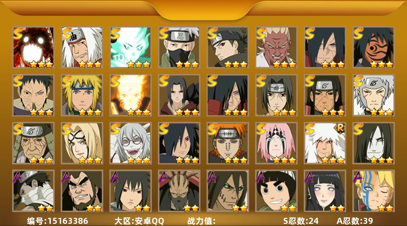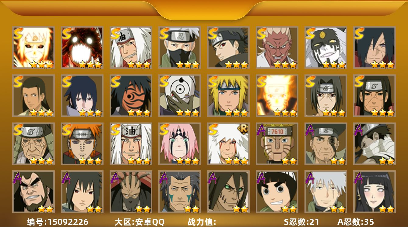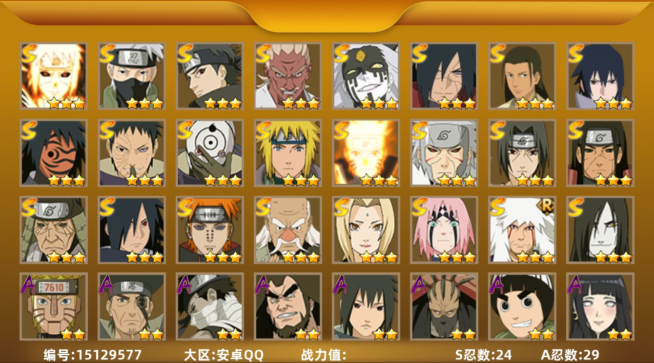 【区服】896【等级】126【s级数量】5【a级数量】13 【s级】自来也「舞之豪杰」 宇智波鼬「须佐能乎」 自来也「传说中的三忍」 漩涡鸣人·宇智波佐助 千手柱间「秽土转生」 【a级】机械鸣人「初始形态」 旗木卡卡西「幻之真容」 猿飞阿斯玛 神农「羁绊」 桃地再不斩「秽土转生」 飞段 迈特凯 迪达拉 迈特凯「青春爆炸」 干柿鬼鲛 纲手「妖怪奇谭」 宇智波鼬 宇智波佐助「须佐能乎」 【b级】佩恩「