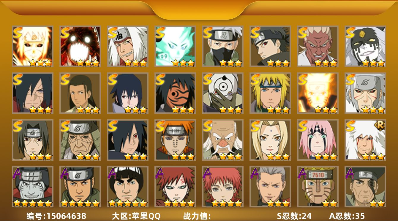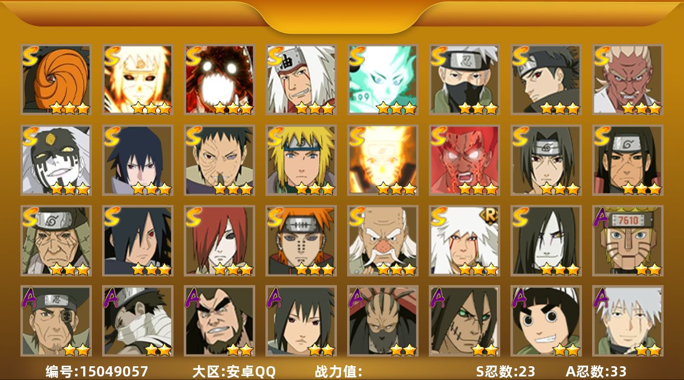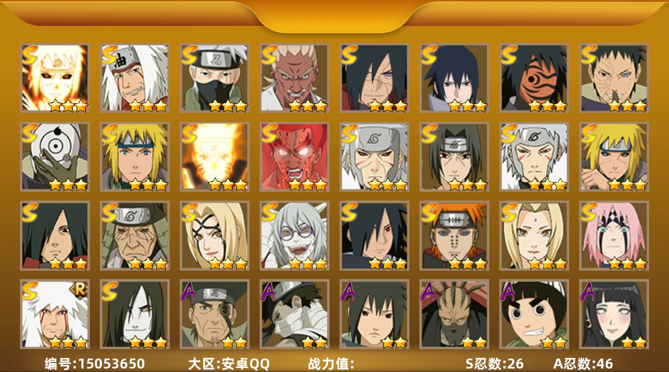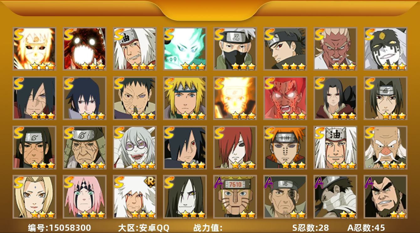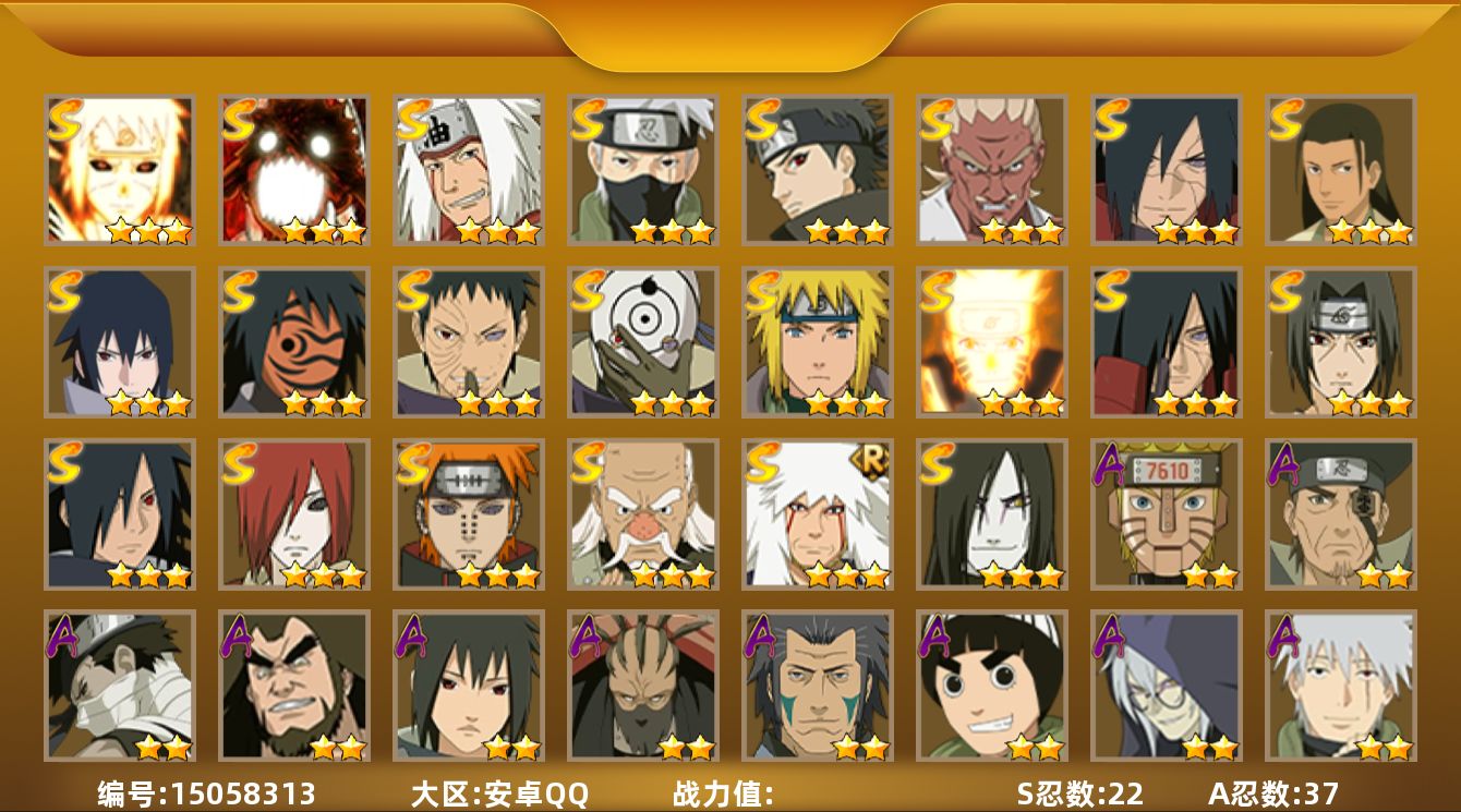 【hyz2978】v4/战力161w/s忍4/a忍9/3星自来也「舞之豪杰」/2星地陆/蜃/3星波风水门「九喇嘛连结」/2星宇智波鼬/2星蝎/蛤蟆吉/2星飞段/3星漩涡鸣人·宇智波佐助/镰鼬/2星旗木卡卡西「幻之真容」/山椒鱼/2星干柿鬼鲛/2星漩涡鸣人「九尾查克拉」/2星迈特凯「青春爆炸」/砂之守鹤/蓝蛇/猿魔/2星卑留呼「火之意志继承者」/忍龟/3星宇智波鼬「须佐能乎」