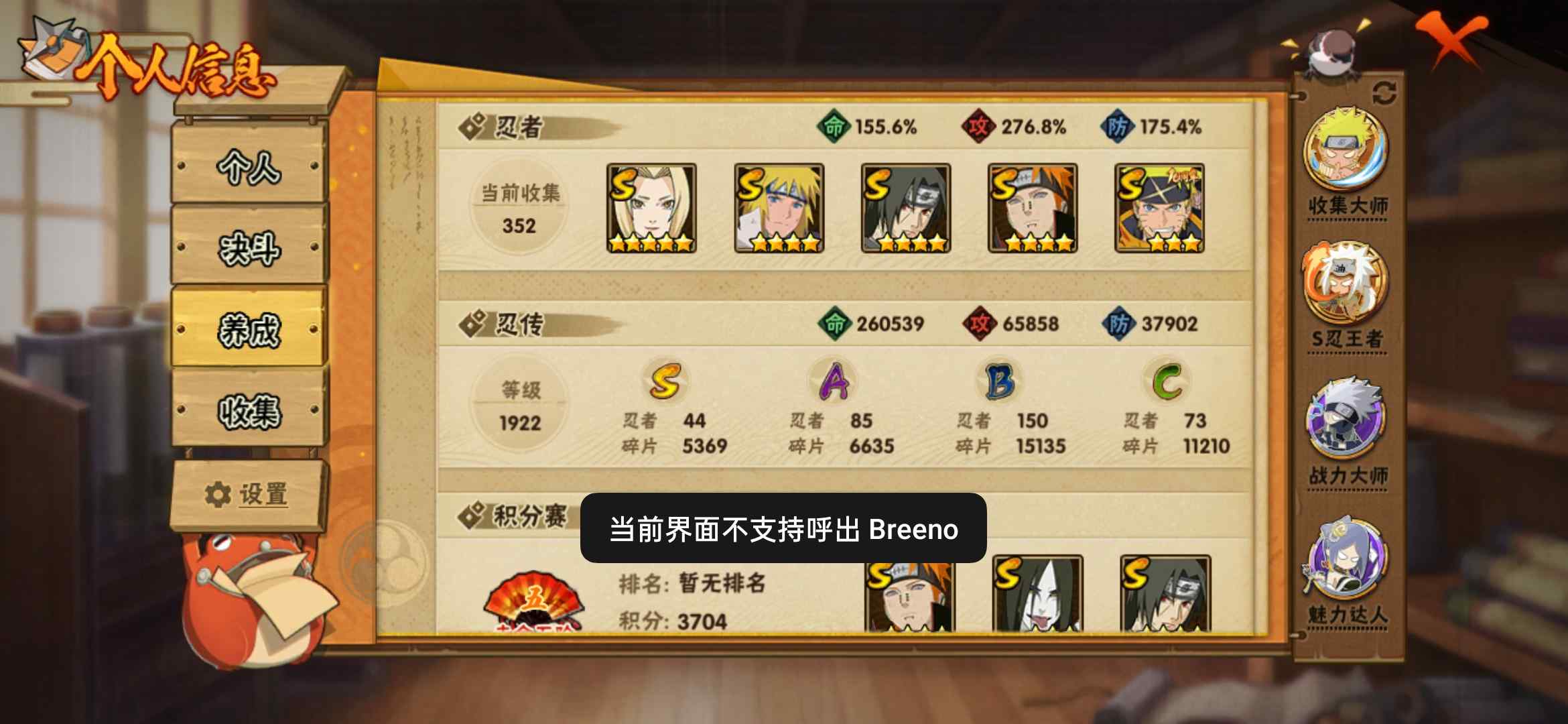 [14849070]0arpkn 号 vip9,1148w战力,s忍22个,a忍46个,本服排名573,战区排名未上榜,通灵兽318个,6时装,影级3阶,忍者星数540