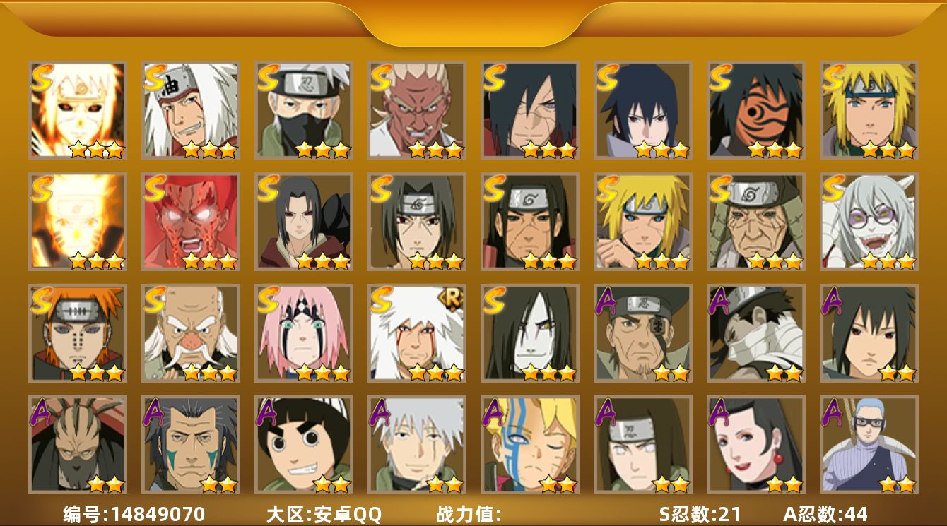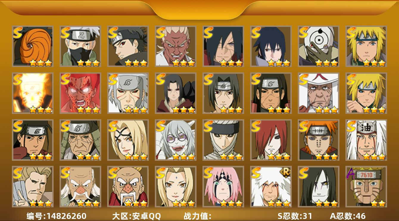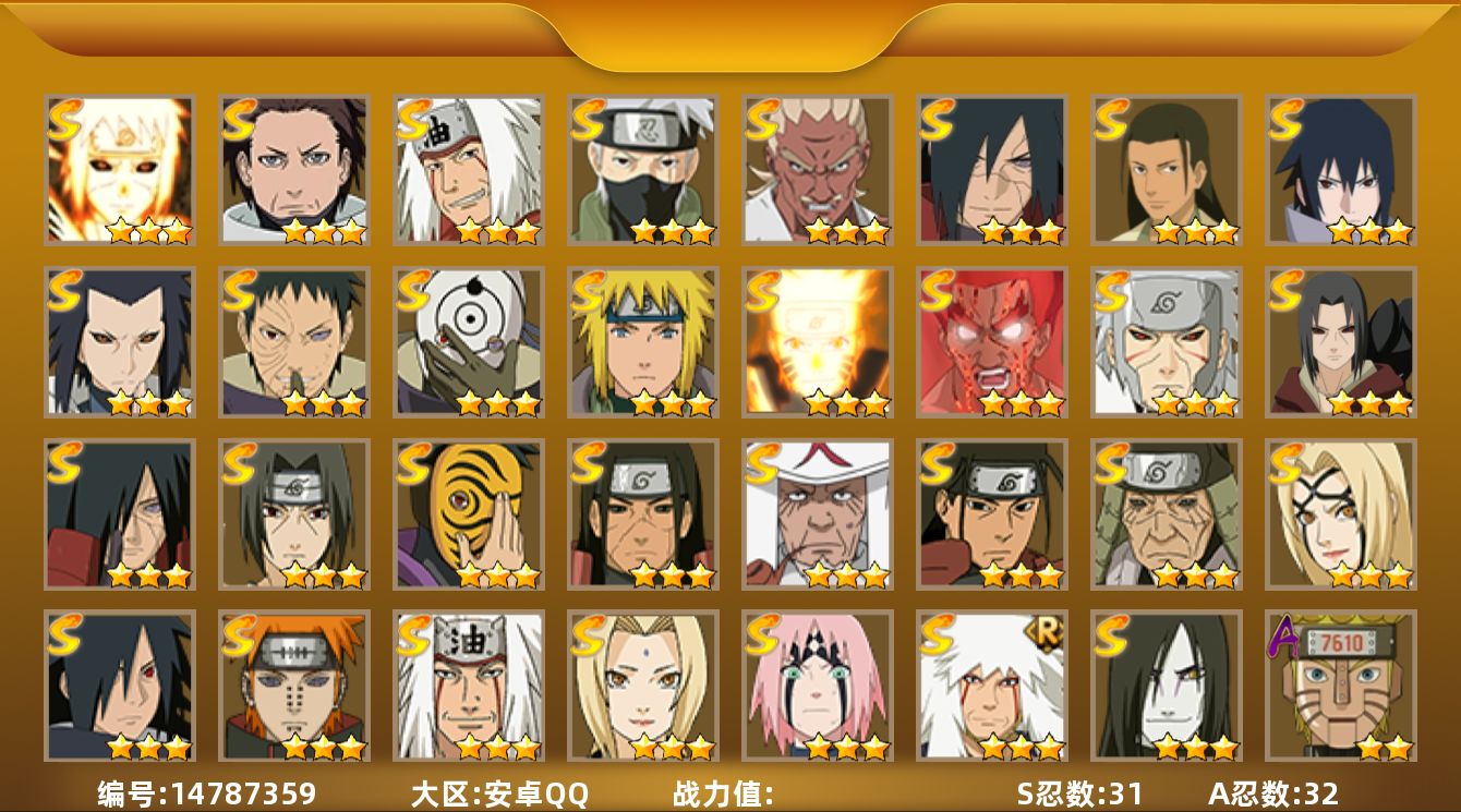 【hyz2982】v10/战力1169w/s忍18/a忍34/2星飞段「死司凭血」/2星宇智波止水/5星猿飞阿斯玛/3星旗木卡卡西「须佐能乎」/3星宇智波斑/3星猿飞日斩「秽土转生」/2星猿飞阿斯玛「秽土转生」/5星迈特凯/2星长十郎「六代目水影」/2星蝎「绯流琥」/2星春野樱「百豪」/3星宇智波斑「白面具」/3星千手柱间/2星佩恩·六道「漂泊浪客」/2星黑土「博人传」/2星药师兜「半蛇斗篷」/2星宇智波佐助「万花筒写轮眼」/2星志村团藏/2星迪达拉/2星漩涡鸣人「九尾查克拉」/2星不缘/2星大蛇丸「晓」/2星日向宁次「忍界大战」/2星宇智波鼬/3星宇智波佐助「永恒万花筒」/3星宇智波鼬「秽土转生」/3星飞段/3星佩恩「天道」/4星蝎/3星波风水门/3星漩涡鸣人「九喇嘛连结」/3星波风水门「秽土转生」/2星秋道丁次「忍界大战」/2星漩涡博人「桃式显现」/3星我爱罗「疾风传」/2星李洛克「忍界大战」/2星波风水门「青年」/3星自来也「舞之豪杰」/3星神秘面具男「红夜之刃」/2星日向雏田「最终章」/2星不风/2星宇智波泉奈/2星旗木卡卡西「幻之真容」/3星大蛇丸/3星艾「忍界大战」/3星宇智波斑「秽土转生·解」/2星艾「青年」/2星宇智波佐助「须佐能乎」/5星干柿鬼鲛/2星千代「近松十人卫」/3星长门「秽土转生」/3星宇智波鼬「须佐能乎」