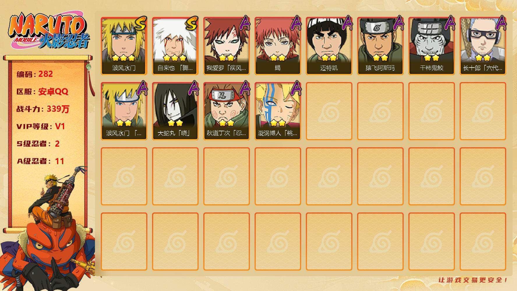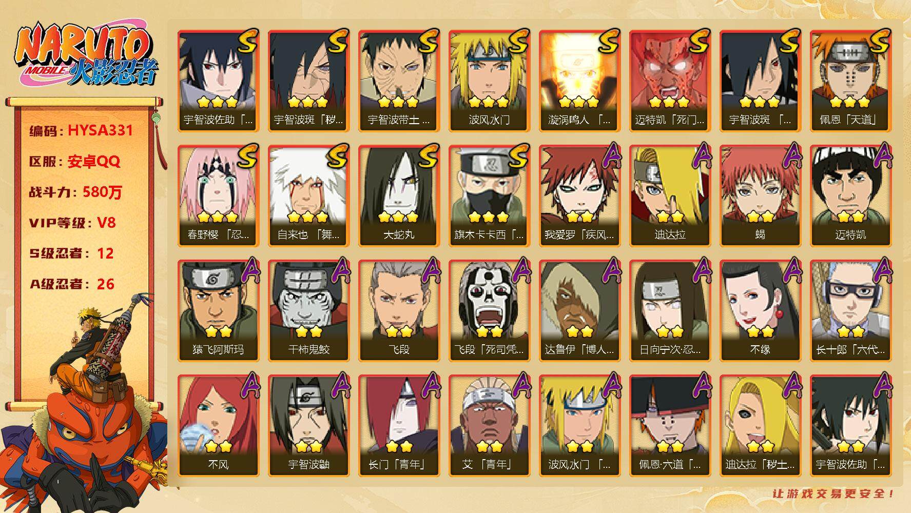 【hysa331】v8/战力580w/s忍12/a忍26/通灵兽15/2星日向宁次「忍界大战」/2星我爱罗「疾风传」/2星达鲁伊「博人传」/2星飞段「死司凭血」/2星宇智波鼬/3星宇智波佐助「永恒万花筒」/3星旗木卡卡西「须佐能乎」/2星长门「青年」/2星迈特凯/3星宇智波带土「忍界大战」/2星蝎/3星佩恩「天道」/2星照美冥「五代目水影」/3星波风水门/3星漩涡鸣人「九喇嘛连结」/2星秋道丁次「忍界大战」/2星漩涡博人「桃式显现」/2星李洛克「忍界大战」/2星长十郎「六代目水影」/2星波风水门「青年」/3星自来也「舞之豪杰」/3星迈特凯「死门」/2星佩恩·六道「漂泊浪客」/2星迪达拉「秽土转生」/2星飞段/2星猿飞阿斯玛/2星不风/3星春野樱「忍界大战」/2星宇智波泉奈/2星迪达拉/2星干柿鬼鲛/3星宇智波斑「木叶创立」/3星大蛇丸/3星宇智波斑「秽土转生·解」/2星艾「青年」/2星不缘/2星宇智波佐助「须佐能乎」/2星千代「近松十人卫」