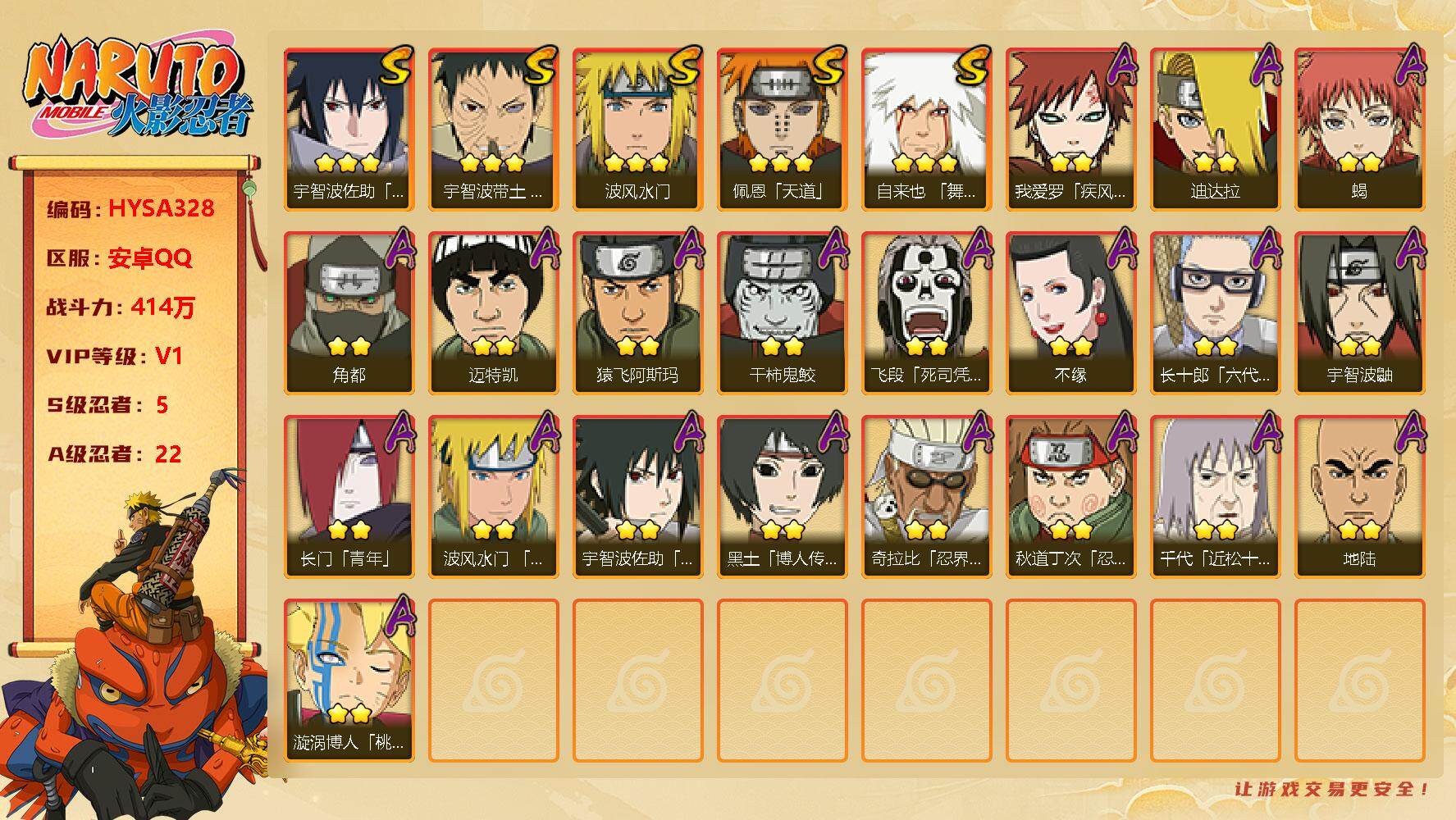 【hysa328】v1/战力414w/s忍5/a忍22/通灵兽13/2星我爱罗「疾风传」/2星飞段「死司凭血」/2星宇智波鼬/3星宇智波佐助「永恒万花筒」/2星长门「青年」/2星迈特凯/3星宇智波带土「忍界大战」/2星蝎/3星佩恩「天道」/3星波风水门/2星秋道丁次「忍界大战」/2星漩涡博人「桃式显现」/2星奇拉比「忍界大战」/2星长十郎「六代目水影」/2星波风水门「青年」/2星蝎「绯流琥」/3星自来也「舞之豪杰」/2星地陆/2星黑土「博人传」/2星猿飞阿斯玛/2星宇智波泉奈/2星迪达拉/2星干柿鬼鲛/2星不缘/2星宇智波佐助「须佐能乎」/2星千代「近松十人卫」/2星角都