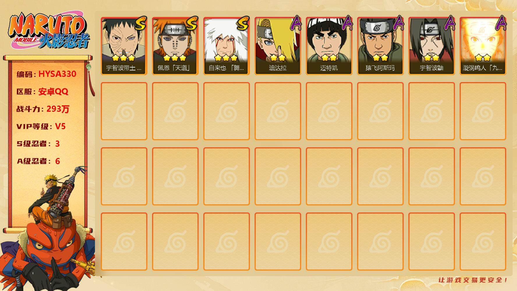 【hysa330】v5/战力293w/s忍3/a忍6/3星自来也「舞之豪杰」/2星宇智波泉奈/2星迪达拉/2星宇智波鼬/2星漩涡鸣人「九尾查克拉」/2星迈特凯/3星宇智波带土「忍界大战」/3星佩恩「天道」/2星猿飞阿斯玛