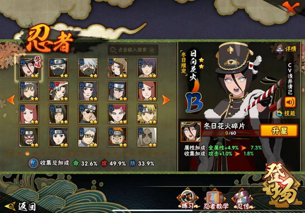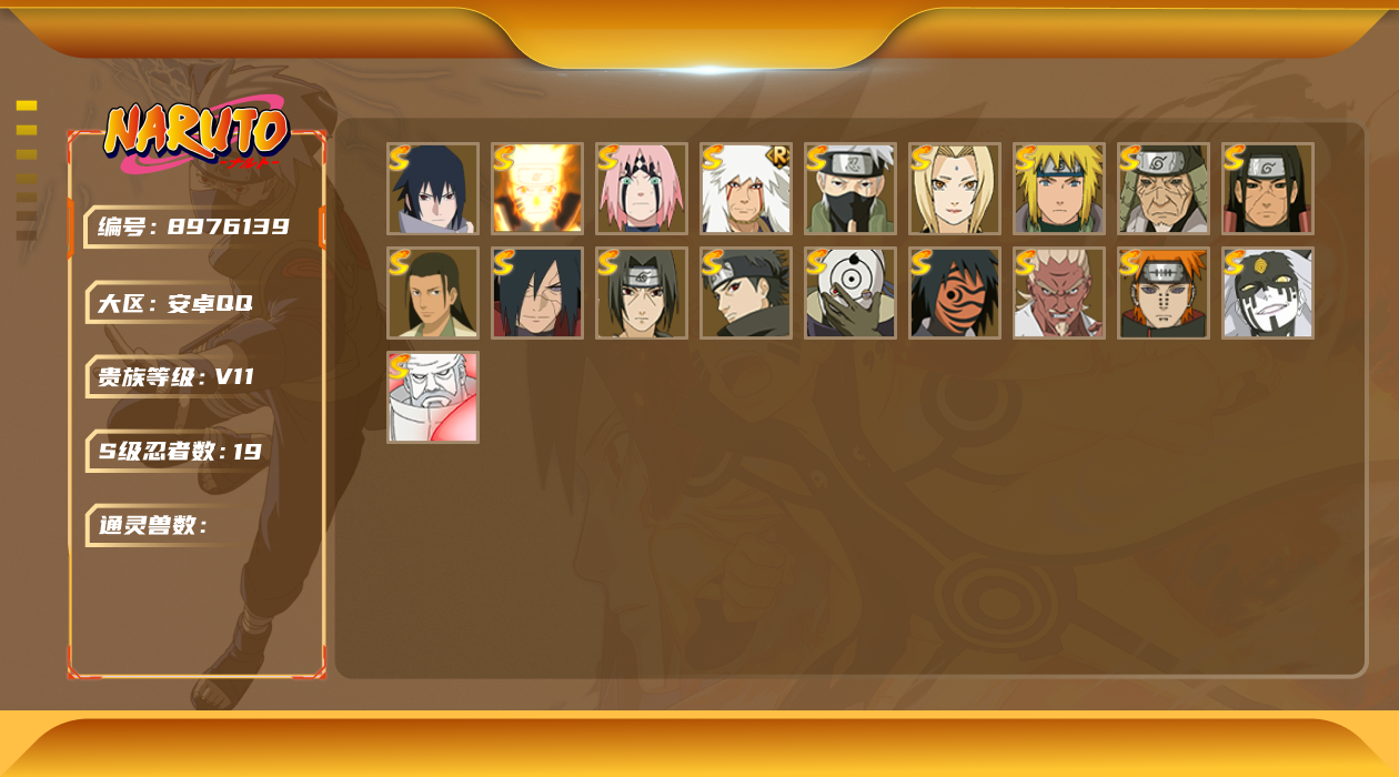 v11 19s 可二次 可修改实名 s级忍者:宇智波止水「须佐能乎」艾「忍界大战」大筒木桃式宇智波斑「秽土转生·解」千手柱间·木叶创立宇智波佐助「永恒万花筒」神秘面具男 「红夜之刃」春野樱 「忍界大战」大筒木金式「博人传」漩涡鸣人 「九喇嘛连结」千手柱间「秽土转生」自来也 「舞