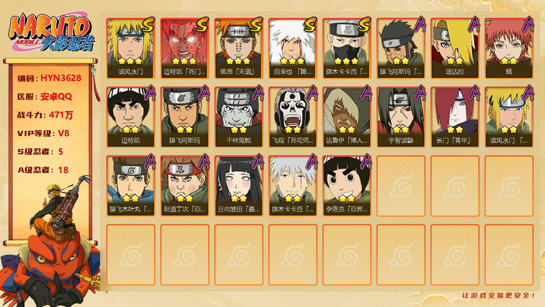 【hyn3628】v8/战力471w/s忍5/a忍18/3星自来也「舞之豪杰」/3星迈特凯「死门」/2星达鲁伊「博人传」/2星飞段「死司凭血」/2星宇智波鼬/3星旗木卡卡西「须佐能乎」/2星长门「青年」/2星迈特凯/2星蝎/2星日向雏田「最终章」/3星佩恩「天道」/2星猿飞阿斯玛/3星波风水门/2星宇智波泉奈/2星秋道丁次「忍界大战」/2星迪达拉/2星旗木卡卡西「幻之真容」/2星猿飞阿斯玛「秽土转生」/2星干柿鬼鲛/2星李洛克「忍界大战」/2星猿飞木叶丸「博人传」/2星波风水门「青年」/2星蝎「绯流琥」