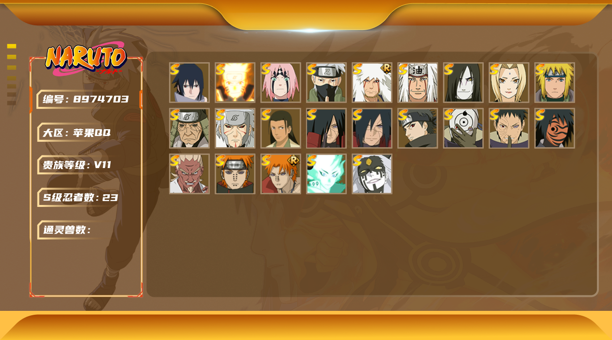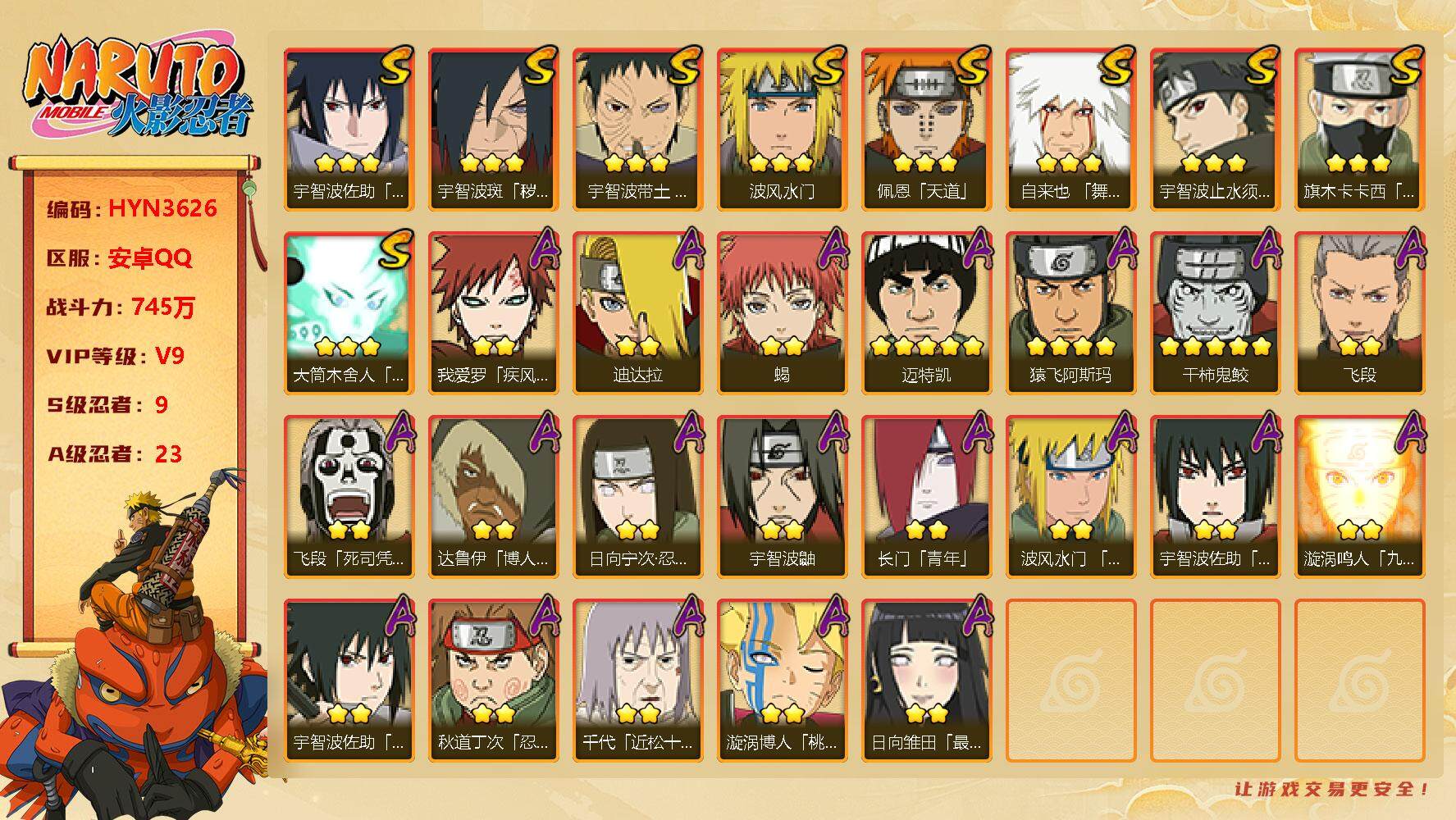 【hyn3626】v9/战力745w/s忍9/a忍23/通灵兽15/2星日向宁次「忍界大战」/2星我爱罗「疾风传」/蜃/2星达鲁伊「博人传」/2星飞段「死司凭血」/2星宇智波鼬/3星宇智波佐助「永恒万花筒」/3星旗木卡卡西「须佐能乎」/2星长门「青年」/蛤蟆健/3星宇智波带土「忍界大战」/2星蝎/3星佩恩「天道」/3星波风水门/3星大筒木舍人「最终章」/乌鸦/2星秋道丁次「忍界大战」/2星角都「秽土转生」/5星迈特凯/2星漩涡博人「桃式显现」/砂之守鹤/蓝蛇/2星波风水门「青年」/2星蝎「绯流琥」/4星猿飞阿斯玛/3星自来也「舞之豪杰」/蛞蝓/3星宇智波止水「须佐能乎」/2星日向雏田「最终章」/蛤蟆吉/2星飞段/镰鼬/2星宇智波佐助「万花筒写轮眼」/2星宇智波泉奈/2星迪达拉/忍犬/山椒鱼/3星宇智波斑「秽土转生·解」/2星漩涡鸣人「九尾查克拉」/2星宇智波佐助「须佐能乎」/猿魔/蛤蟆仙人/蛤蟆龙/5星干柿鬼鲛/2星千代「近松十人卫」/忍龟/鲛鲨