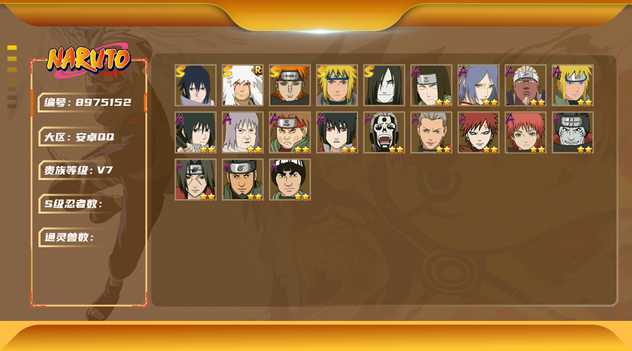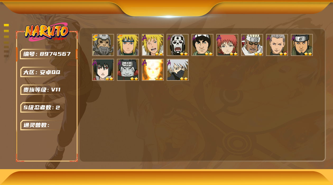 [8974865]xr38275-战力264w-果q-可修改-4s级忍者数-7a级忍者数 【s级忍者】:自来也「舞之豪杰」3星,波风水门3星,佩恩「天道」3星,宇智波斑 「白面具」3星宇智波斑「白面具」 【a级忍者】:干柿鬼鲛2星,迈特凯2星,宇智波鼬2星,宇智波佐助「须佐能乎」2星,黑土「博人传」2星,千代「近松十人卫」2星,宇智波泉奈2星