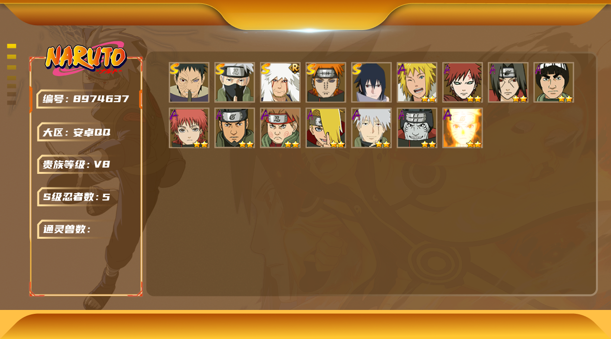 [8974710]v6 5s忍 221.4w战力 可二次 s级忍者:宇智波斑「秽土转生·解」宇智波佐助「永恒万花筒」自来也 「舞之豪杰」佩恩「天道」波风水门